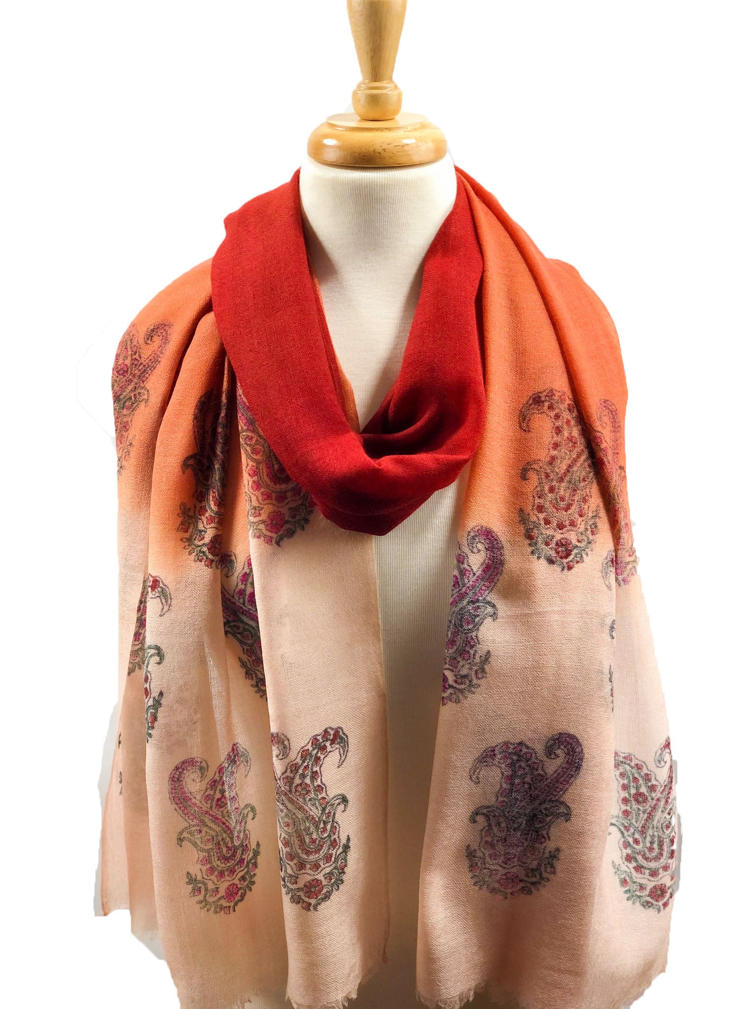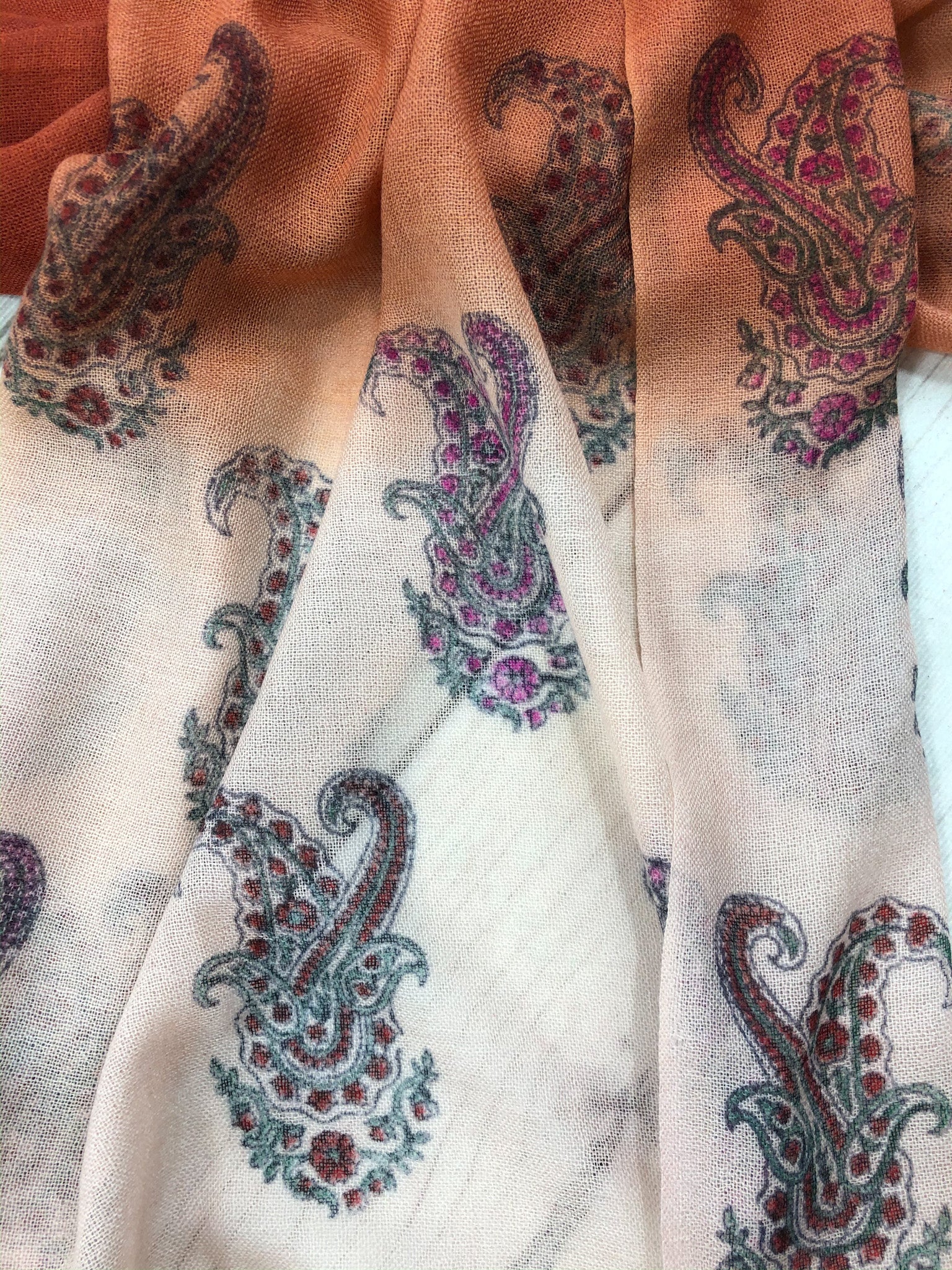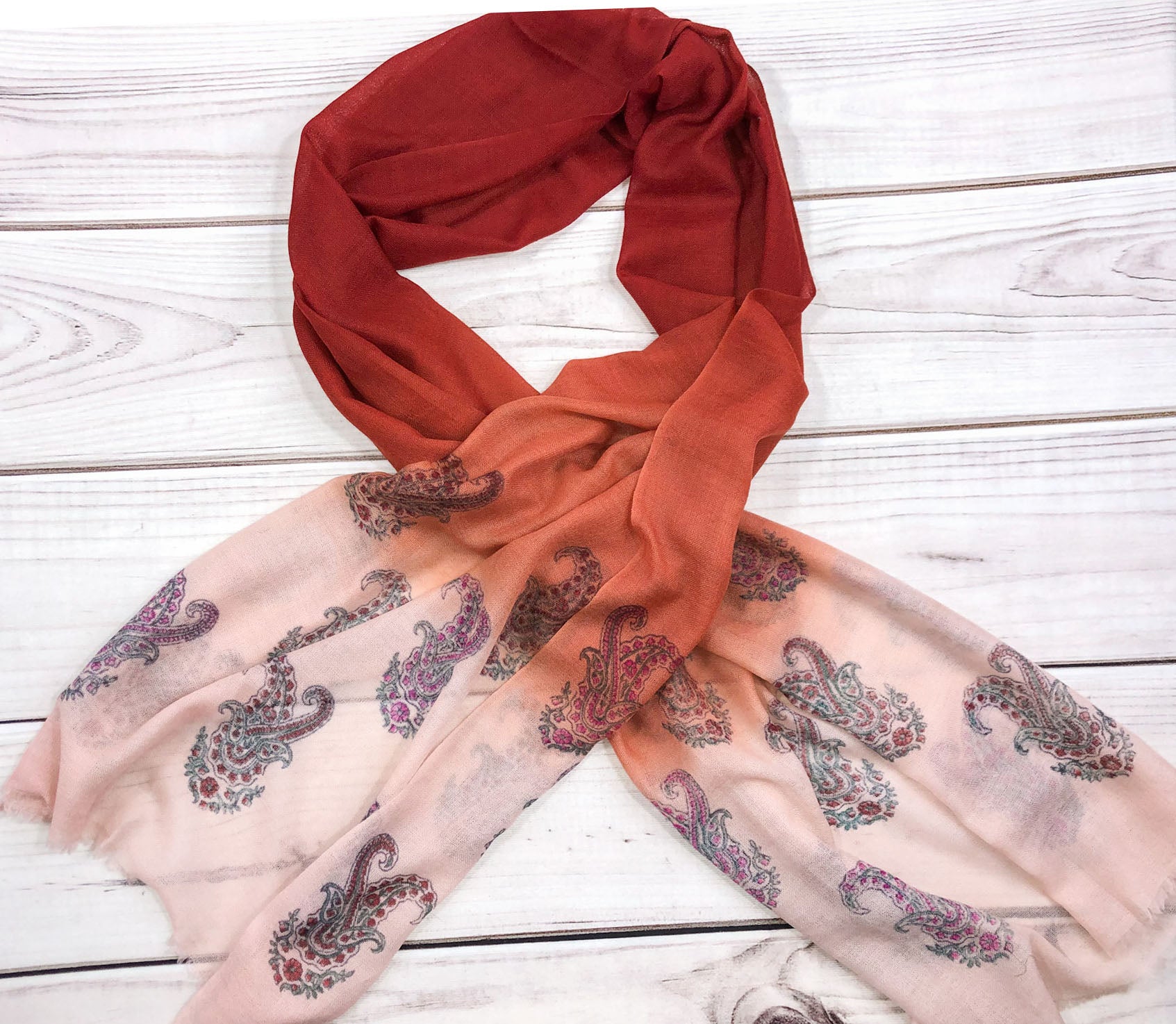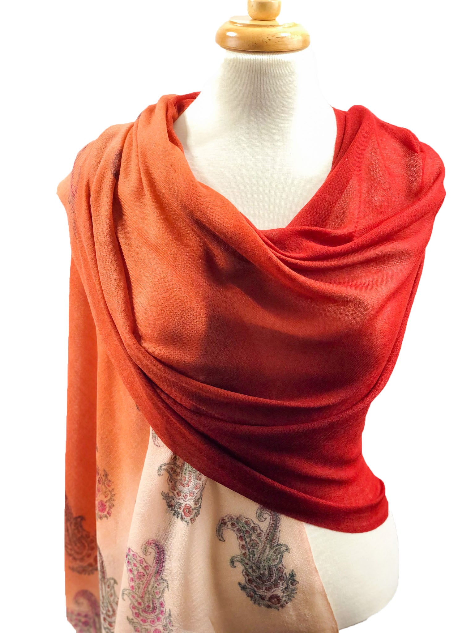 Hand painted screen print wool scarf in gorgeous colors. Soft, light and warm. Gauze weave scarf with a sheer look. Eyelash fringes on both sides.