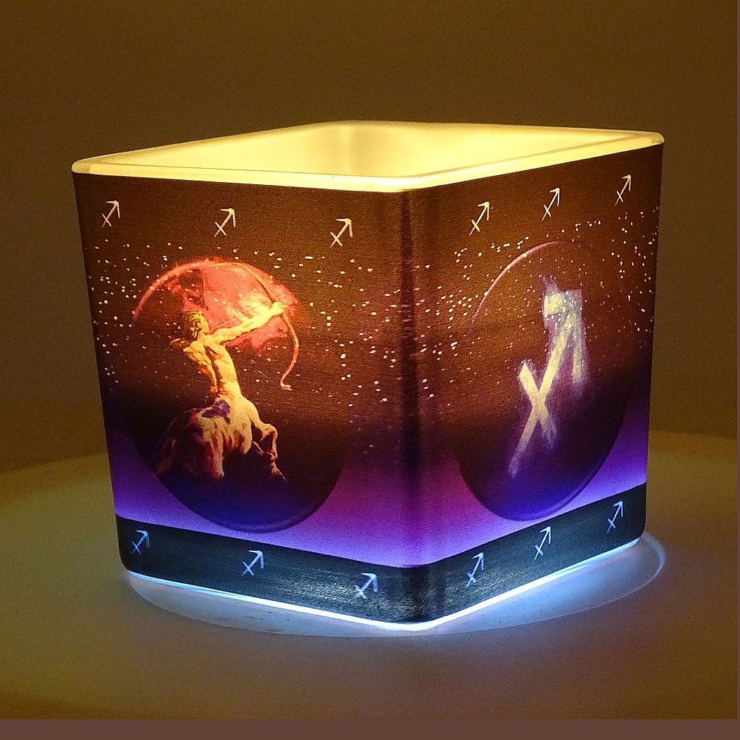 The zodiac sign of Sagittarius on the square glass comes to life when the candle is lit. When the wax melts, the glitter sparkles with the light of the flame as it releases its aroma. With a cork lid that protects the candle from dust when not in use.