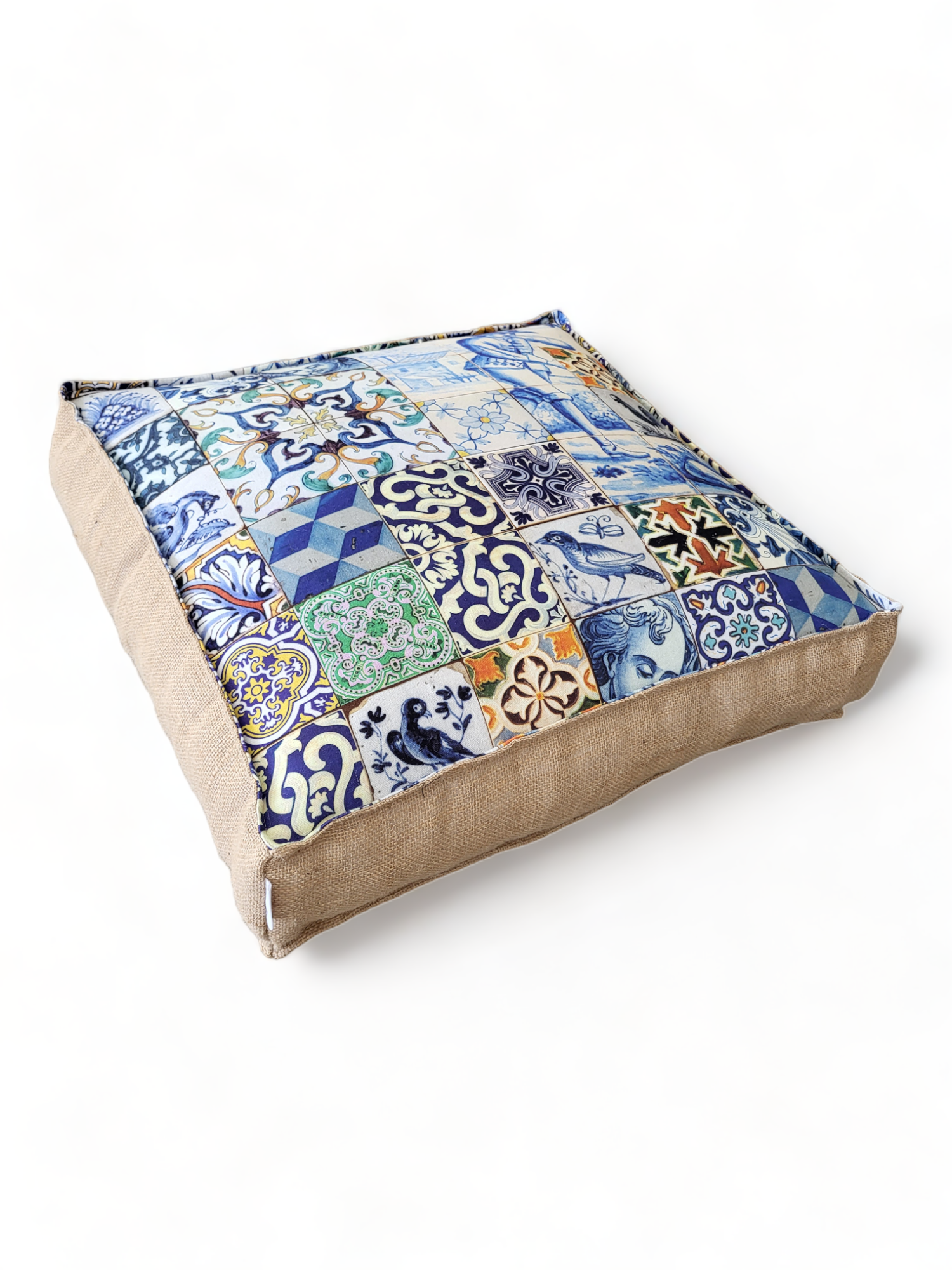 For the passion that we have for the Mediterranean style. We have created a special edition of a Portuguese Azulejo Poufs made of Natural cotton and natural jute, the filling is with foam flakes and a top layer of fiber creating an extra cloudy comfort.
