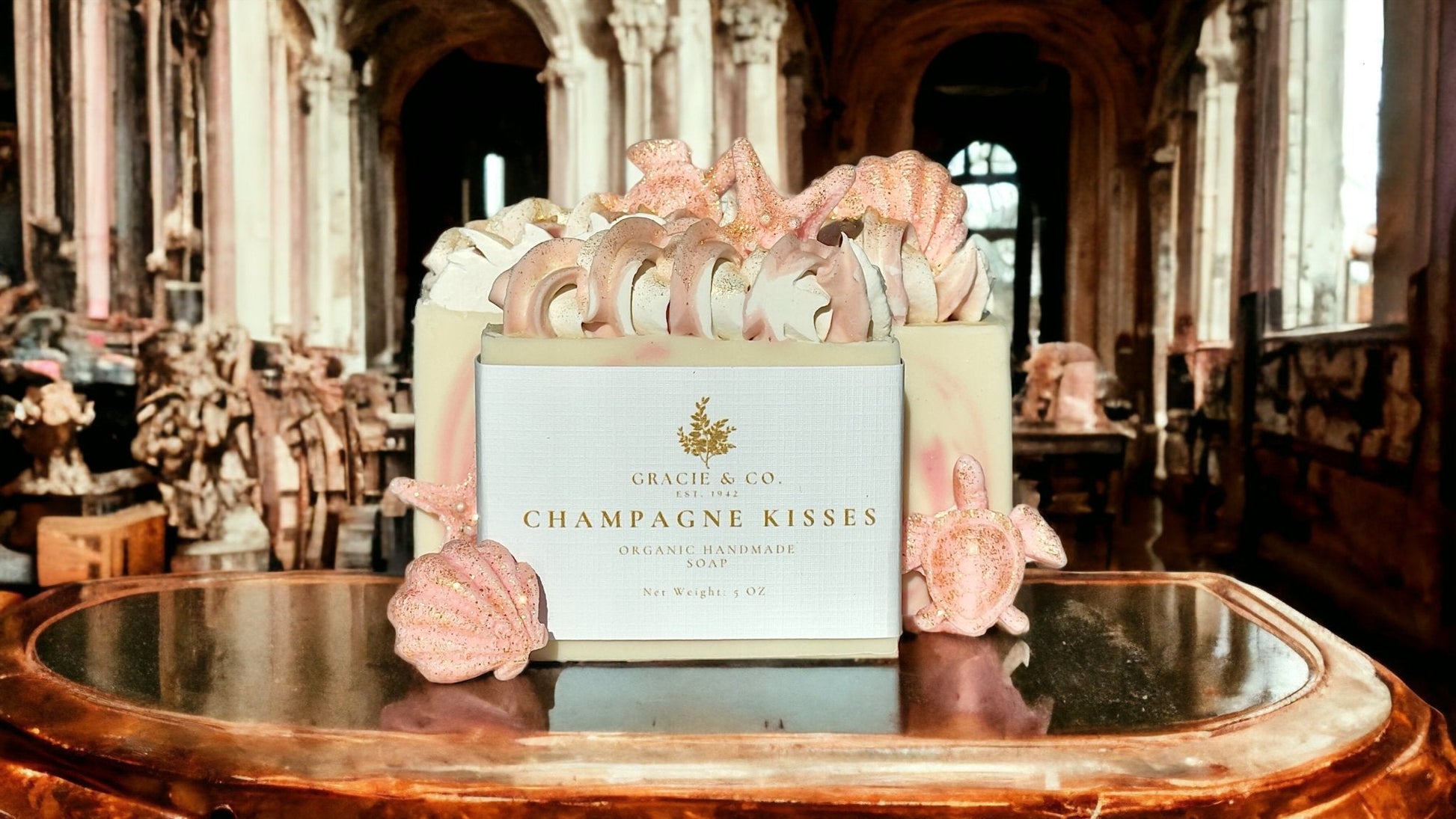 Indulge in the lavish allure of 'Champagne Kisses,' where effervescent bubbles of champagne intertwine with delicate hints of zesty citrus. This opulent blend is crafted to exude sophistication and elegance, leaving your senses enraptured by the luxurious aroma. Infused with nourishing shea butter, each use is a pampering experience, while the soap's exquisite design, adorned with delightful embellishments, adds a touch of glamour to your daily routine. Elevate your bathing ritual to a realm of pure indulgence with 'Champagne Kisses,' a celebration of decadence and refinement.