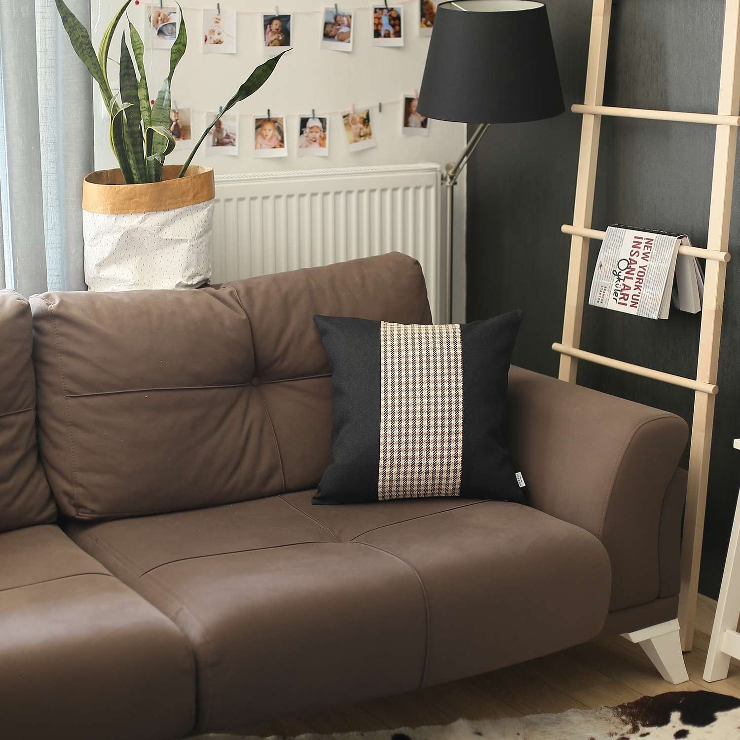 Emphasizing the elegance of modern artistry, this Black and Tan Houndstooth Throw Pillow will induce a rich and luxurious appeal to your contemporary living space. The matte black surface flanking a midsection with tan and white jacquard weaved houndstooth pattern to elevate the entire look for visual contrast. Skilfully crafted in Turkey with OEKO-TEX Standard 100 certified polyester fabric to ensure high product safety and durability. This pillow should only be spot cleaned to keep its shine for years to come. For a seamless unified finish on the touch, the pillow sport an all-around hidden zipper closure while the soft poly filling inside provides maximum comfort. This classic decorative pillow will effortlessly blend in your modern household and align with your sense of interior styling. 18” x 18” x 1”