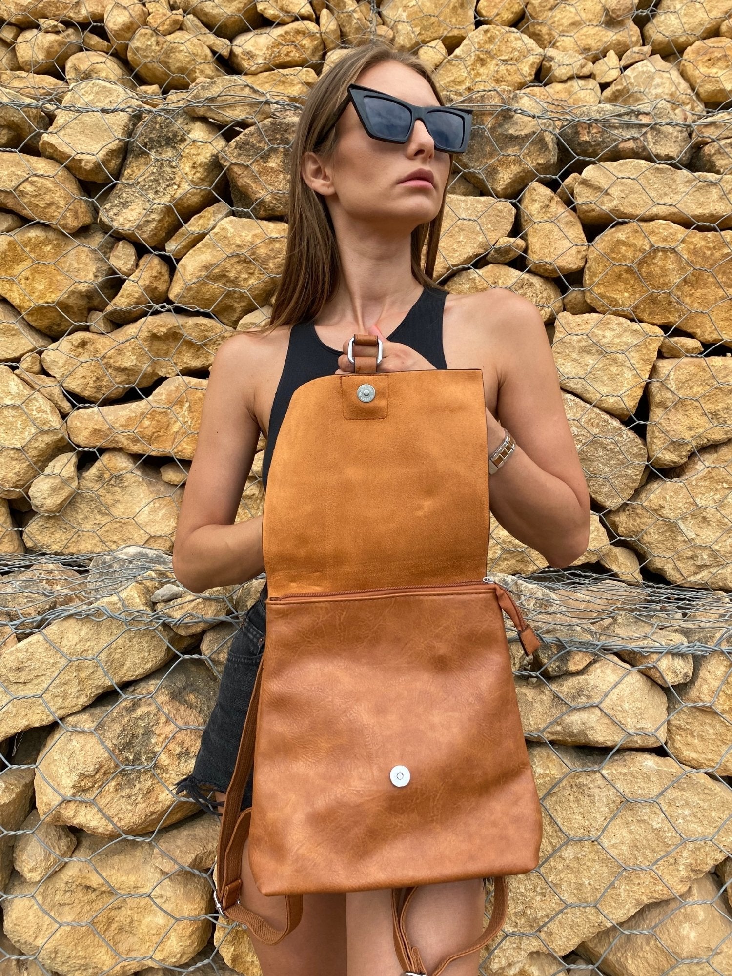 We present a new Brown Backpack, this version is embellished with metallic hardware.