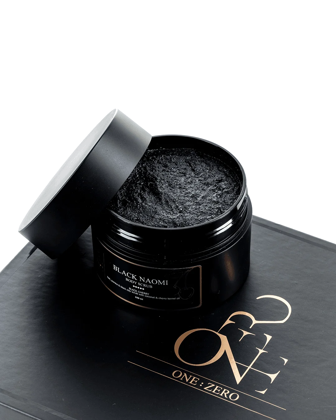 Ingredients: Sodium Chloride, Aqua, Pumice, Black Clay, Cocos Nucifera (Coconut) Oil, Prunus Cerasus (Cherry) Seed Oil, Glycerin, Polyglyceryl-3 Methylglucose Distearate, Glyceryl Stearate, Parfum, Potato Starch Modified, Activated Charcoal (Carbon), Benzyl Alcohol, Dehydroacetic Acid, Citric Acid, Citral, Limonene