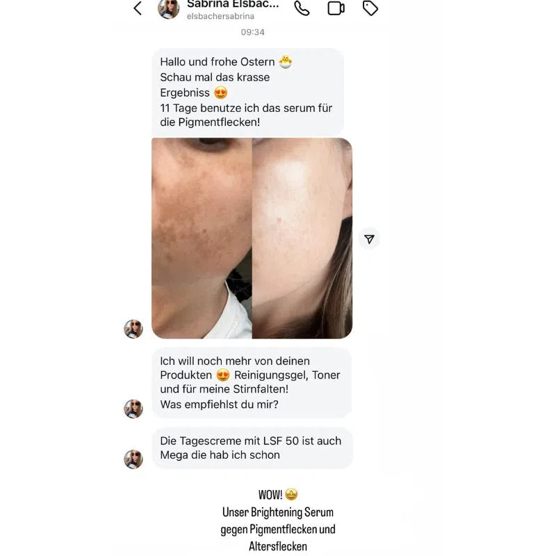 Das Brightening Serum ist eine wirkungsvolle Formel, die das gesamte Gesicht oder gezielt aufzuhellende Bereiche pflegt. Es fixiert sich auf dunklen Hautstellen, während es den Rest der Gesichtshaut pflegt.