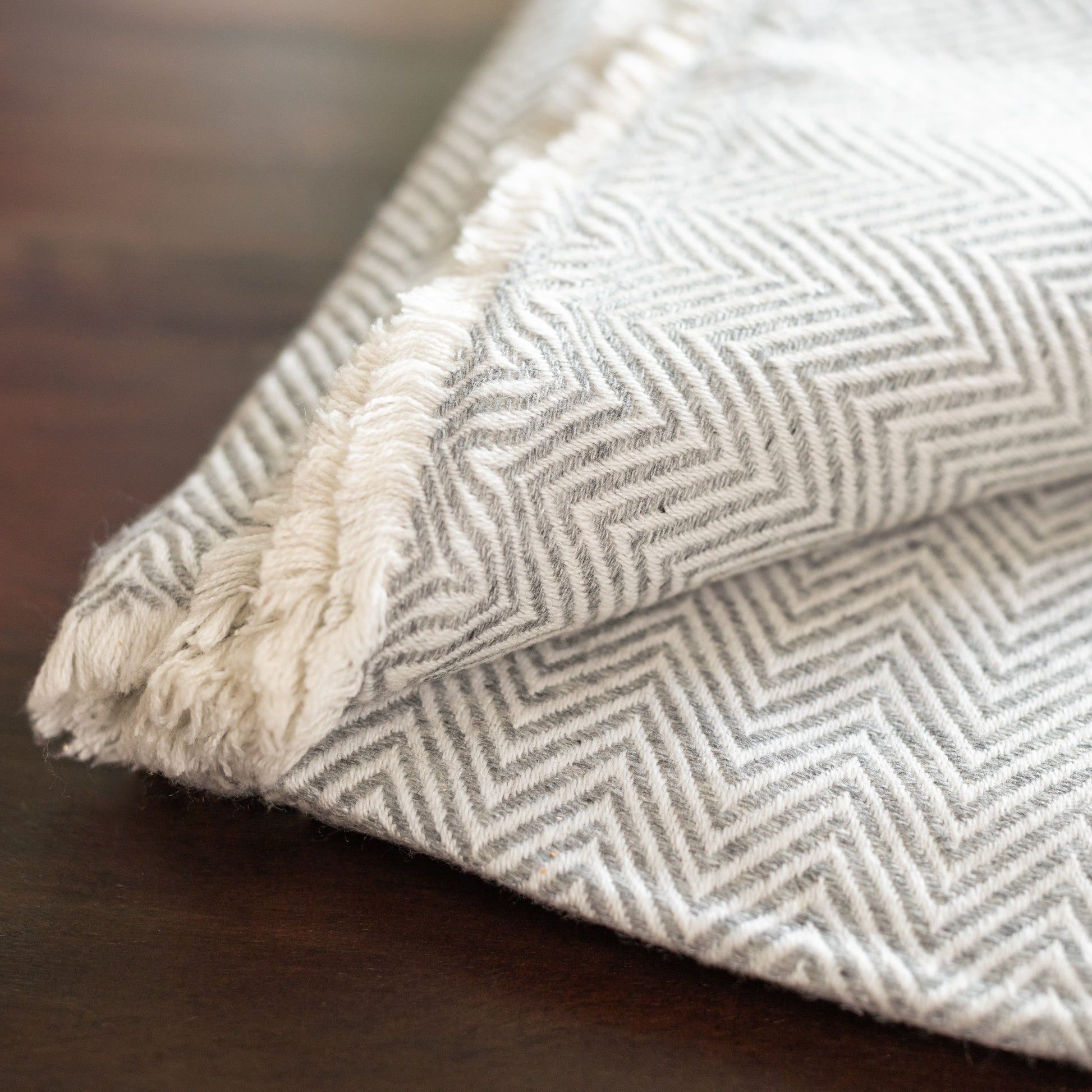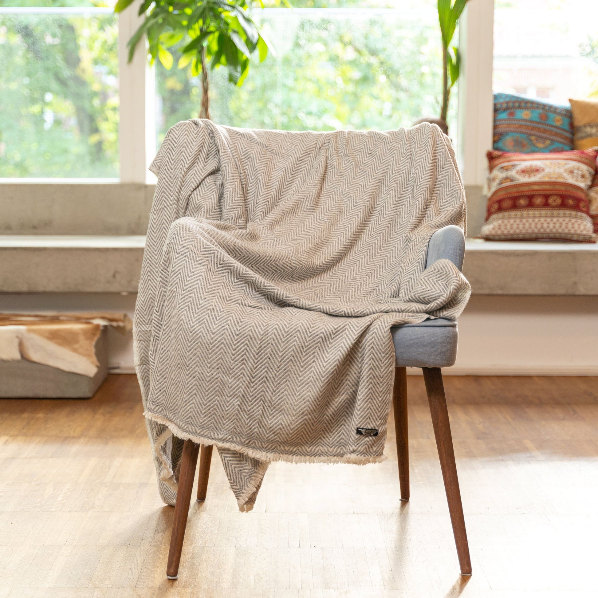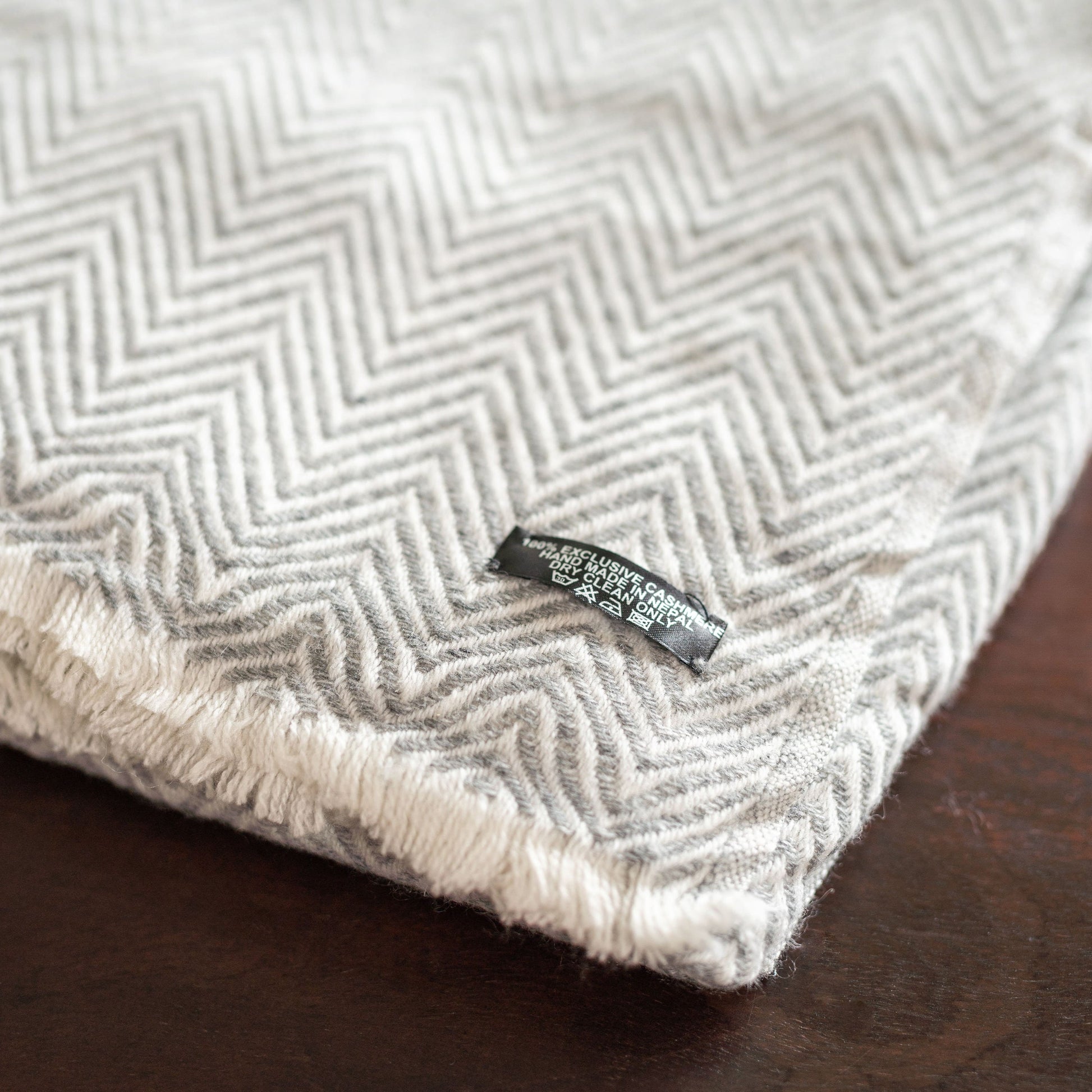 Kaschmirdecke grau mit großem Fischgrätenmuster