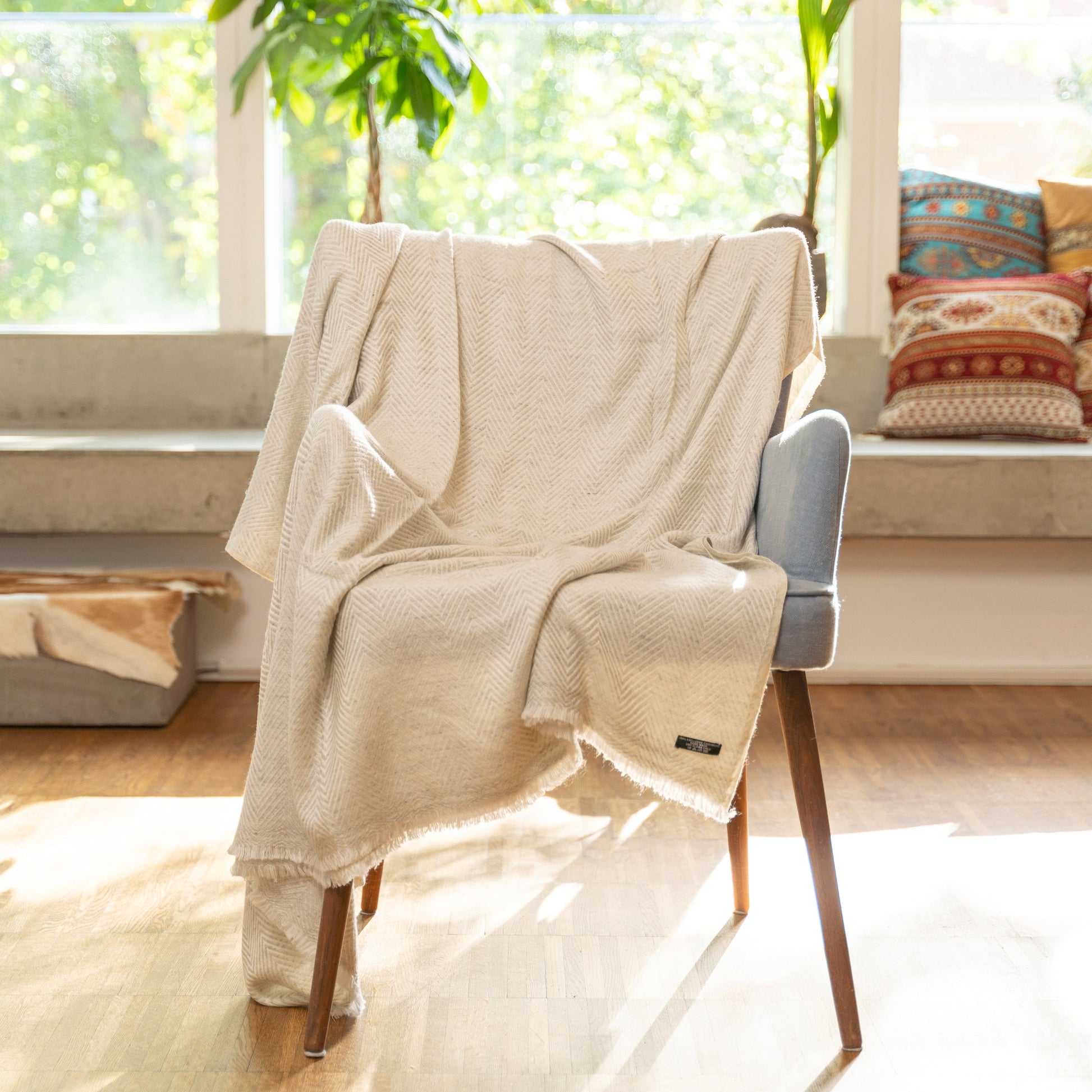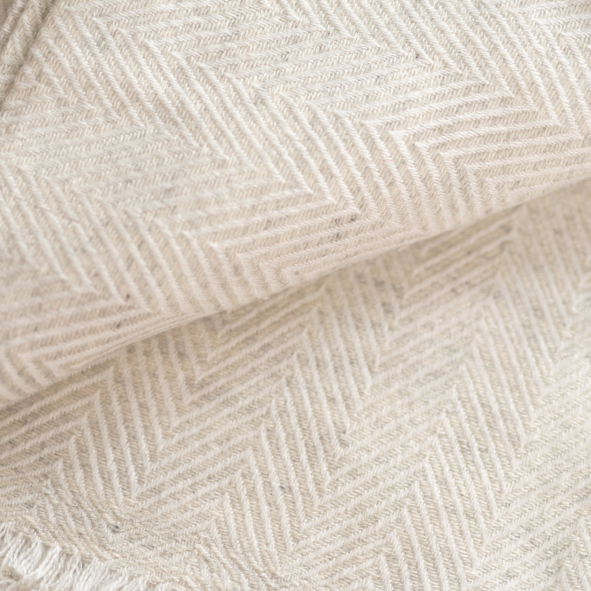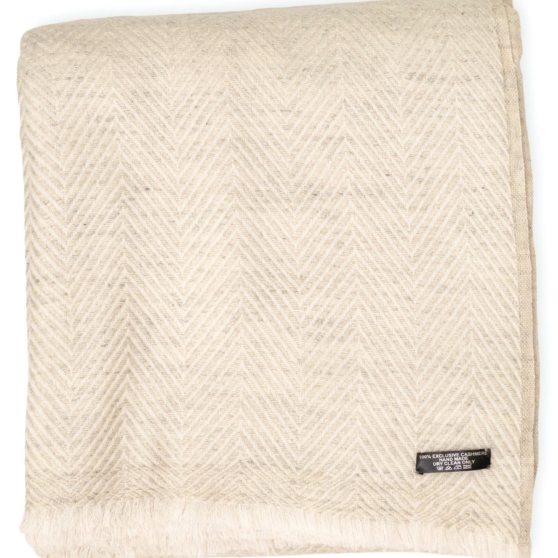 Kaschmirdecke weissgrau mit großem Fischgrätenmuster