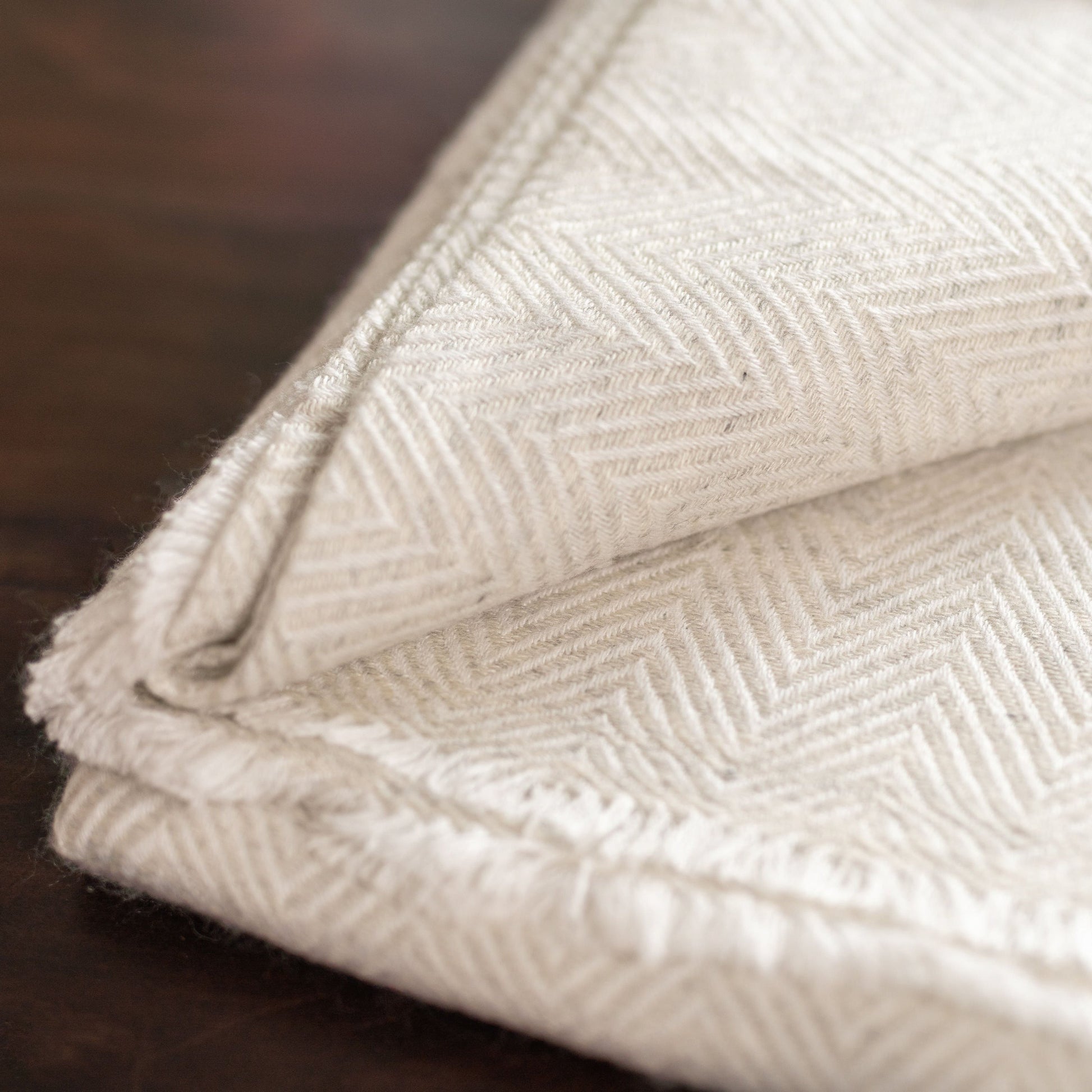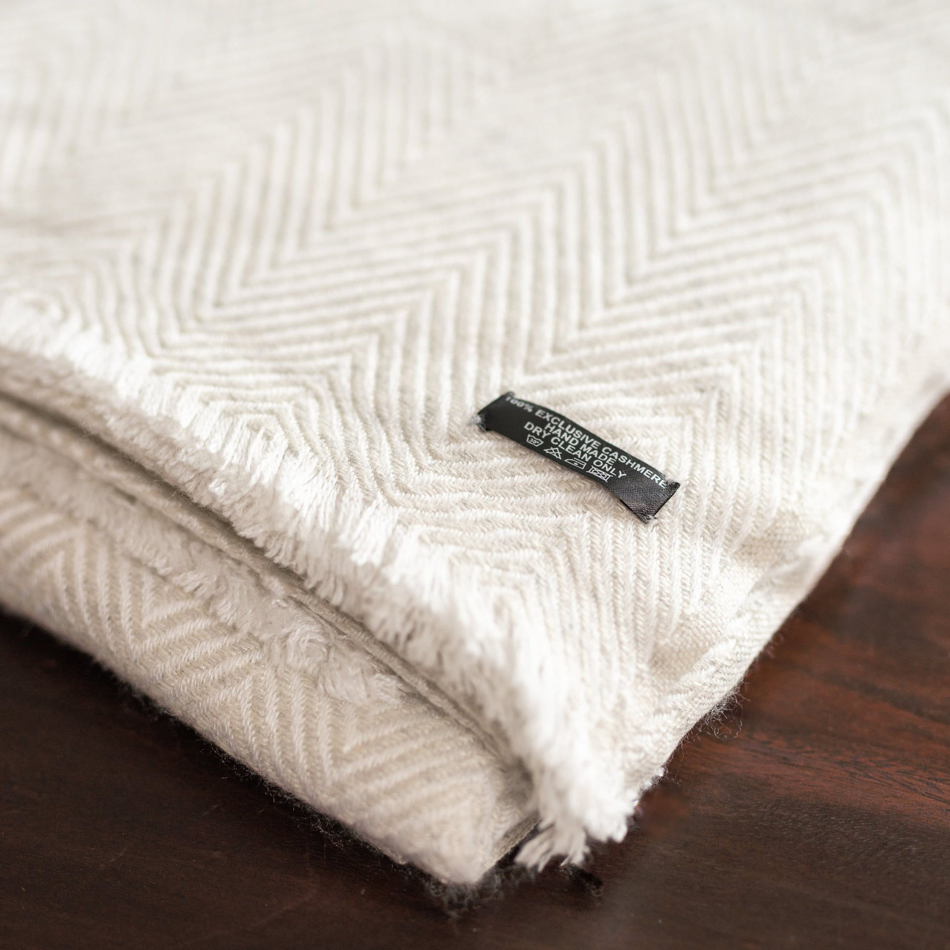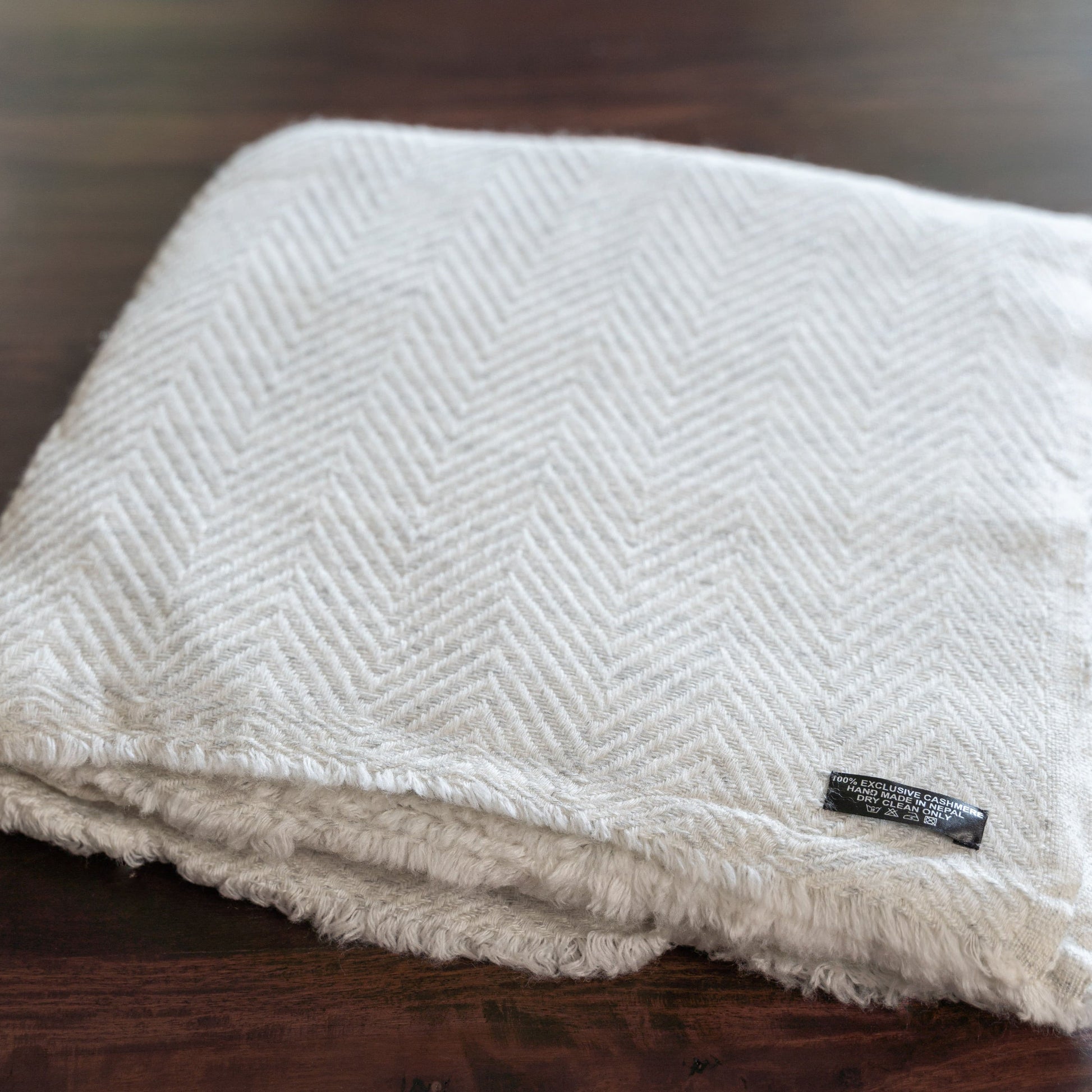 Kaschmirdecke weissgrau mit großem Fischgrätenmuster
