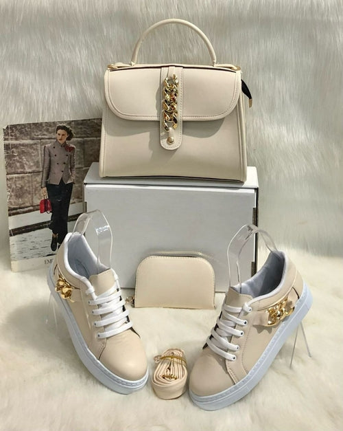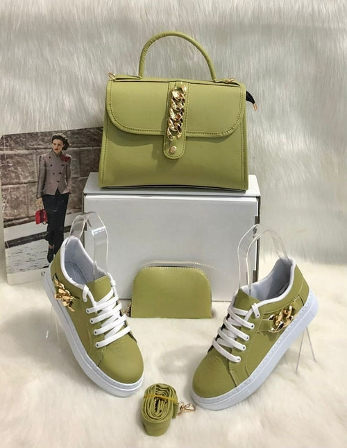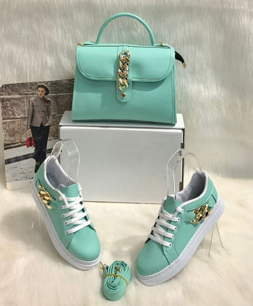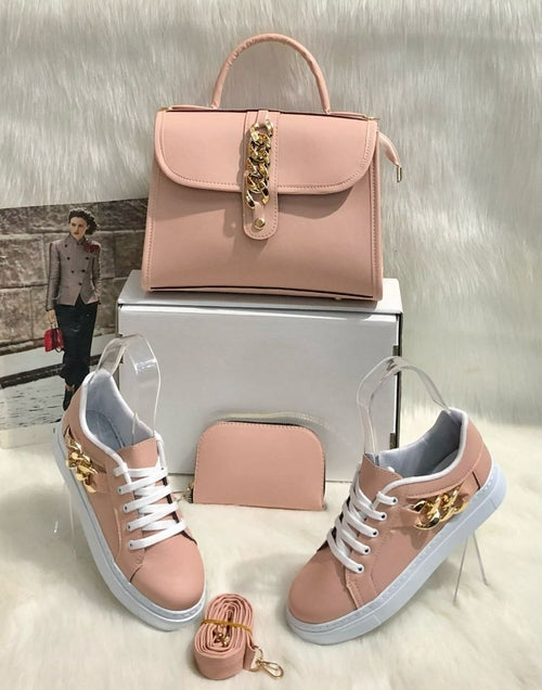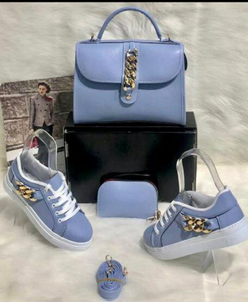 This 3 piece set includes 1 matching bag, 1 matching sneakers and 1 matching wallet. The size of the bag is medium portable, easy to carry and very lightweight. The material of the product is PU leather which makes it even more durable. The sneaker shoes are very stylish and trendy also for this season.