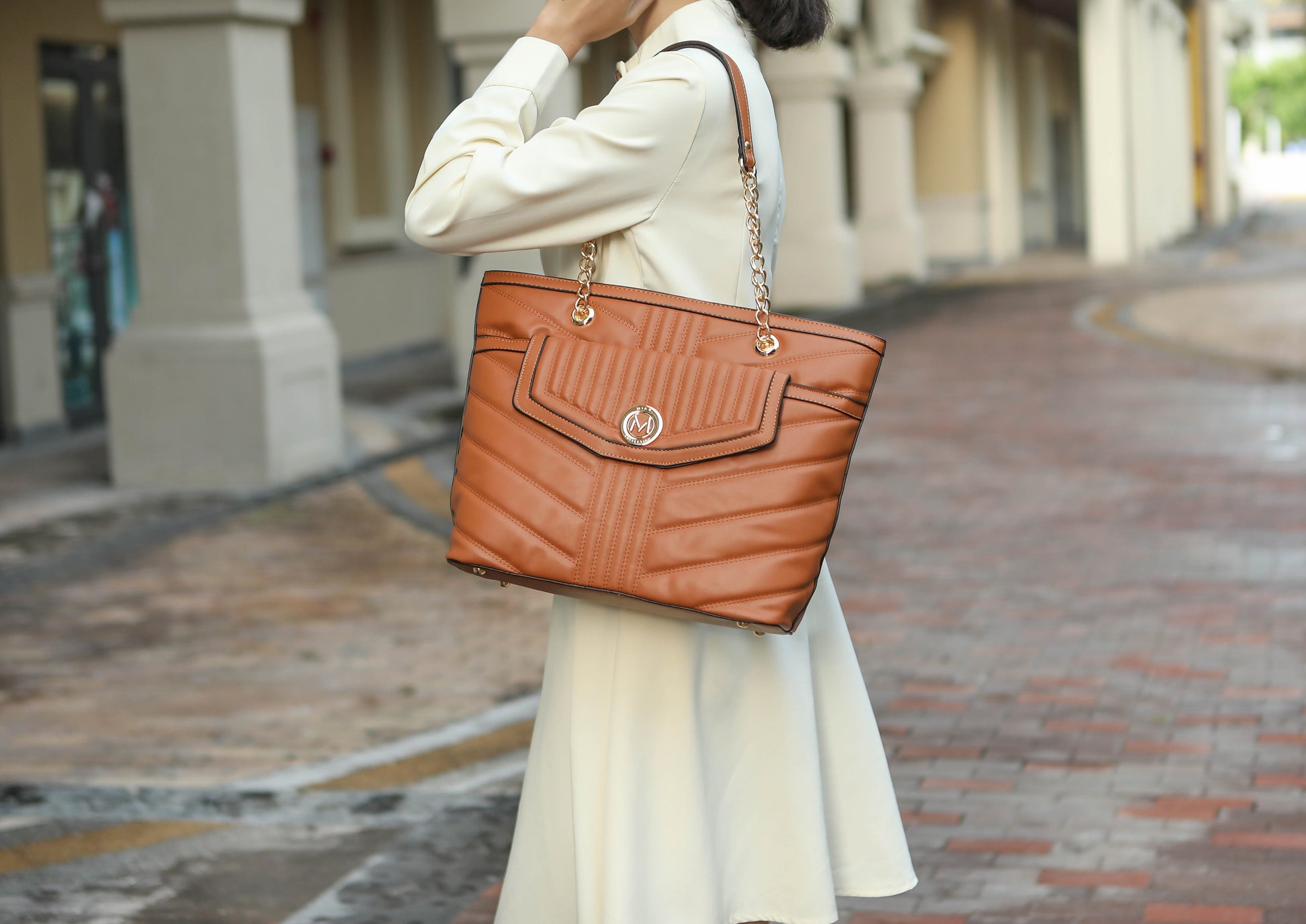 - Our Chiari Tote Bag is a slightly structured style you will carry time and again. Crafted from high-quality vegan leather, this large carryall is spacious enough to hold everything you need, making it the perfect everyday piece. Our Chiari Tote Bag unzips to reveal a fully lined and spacious interior, with slip pockets and a wall zippered pocket. A convenient exterior front pocket and snap fastening with our emblem will keep your necessities neatly in place. Metal feet in a flat base keep bag in the upright position. It comes with a matching wallet with a wristlet handle