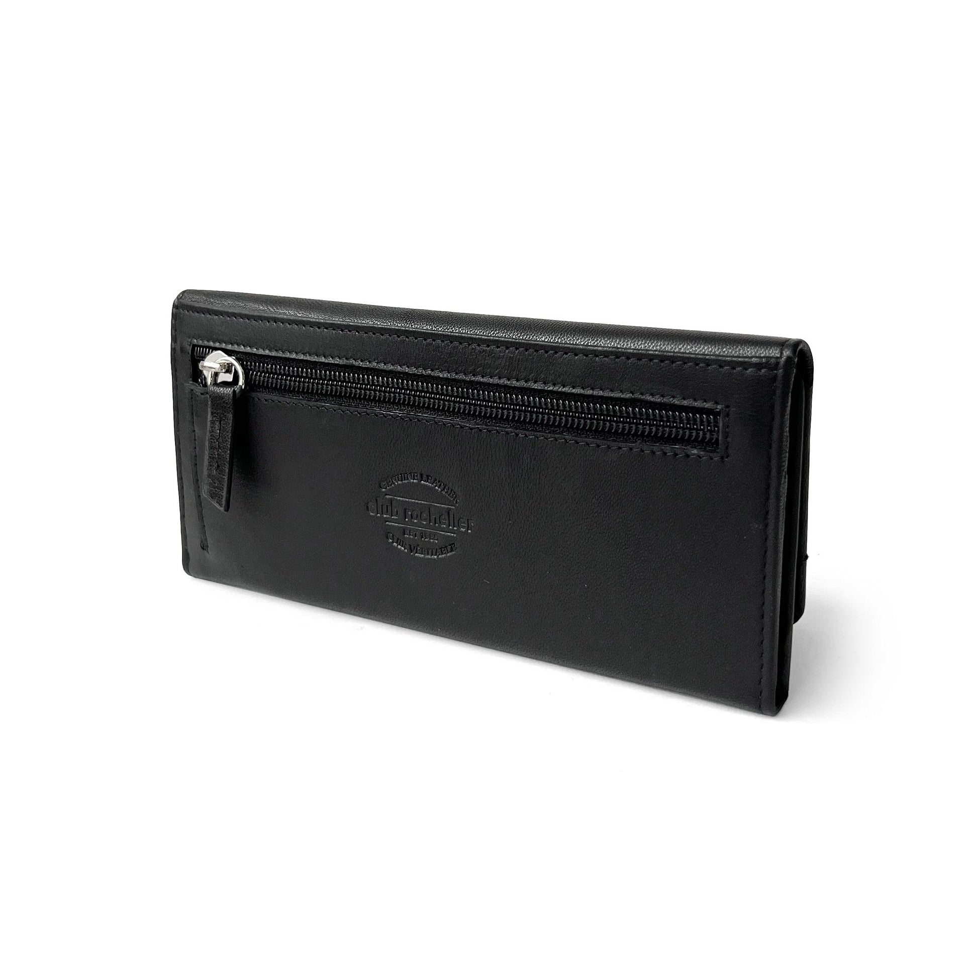 This woman's slim trifold wallet by Club Rochelier is versatile, functional and durable. The wallet features the latest RFID blocking technology to protect you from digital theft, 14 card slots to store your credit cards, business cards and more, 3 ID windows allows for quick viewing of your driver's license and other forms of ID. The bill compartment and the back zipper pocket allows for safe carrying of cash and coins. Great hand feel, fine workmanship and practical design, you'll love this wallet!