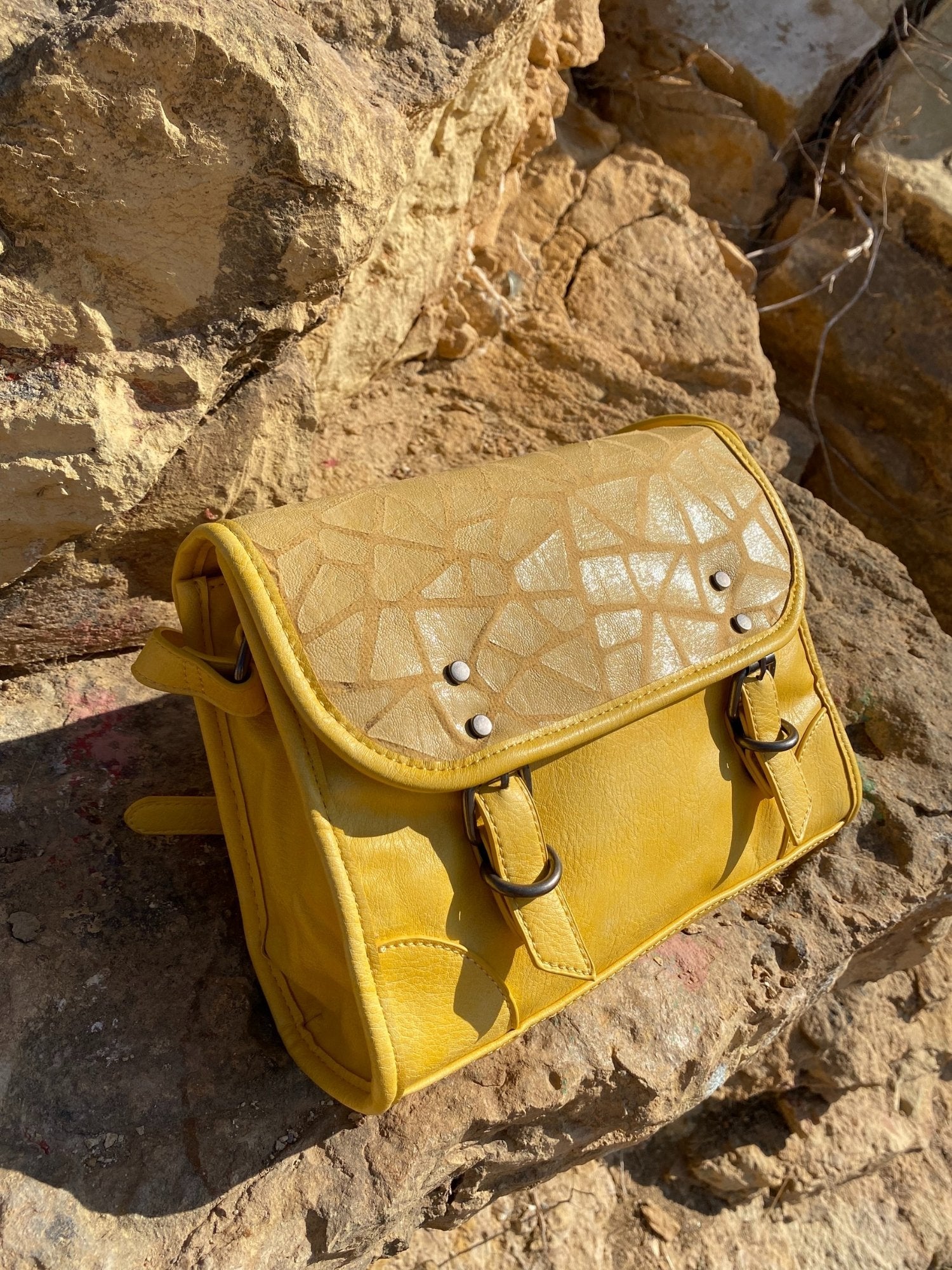 Crossbody bag in yellow. Rectangular-shaped exterior. Metallic details at front. Adjustable crossbody shoulder strap. Lined interior with card slot. Magnetic closure.