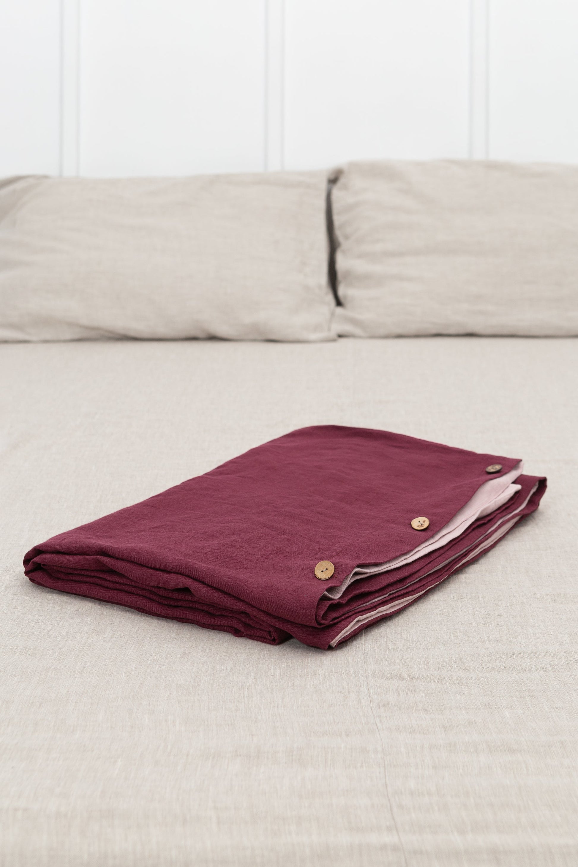 Two-sided bedding set in Dark Plum and Pale Pink from softened stonewashed linen is designed to make your bedroom elegant and beautiful, same time providing you with the best night's sleep. With this new reversible bedding, you can decorate your room according to your mood easily. It will help you easily create a minimal, Scandinavian look in your bedroom and help you enjoy restful nights. The items are made with special coconut buttons closure, which makes it a nice detail in this set.