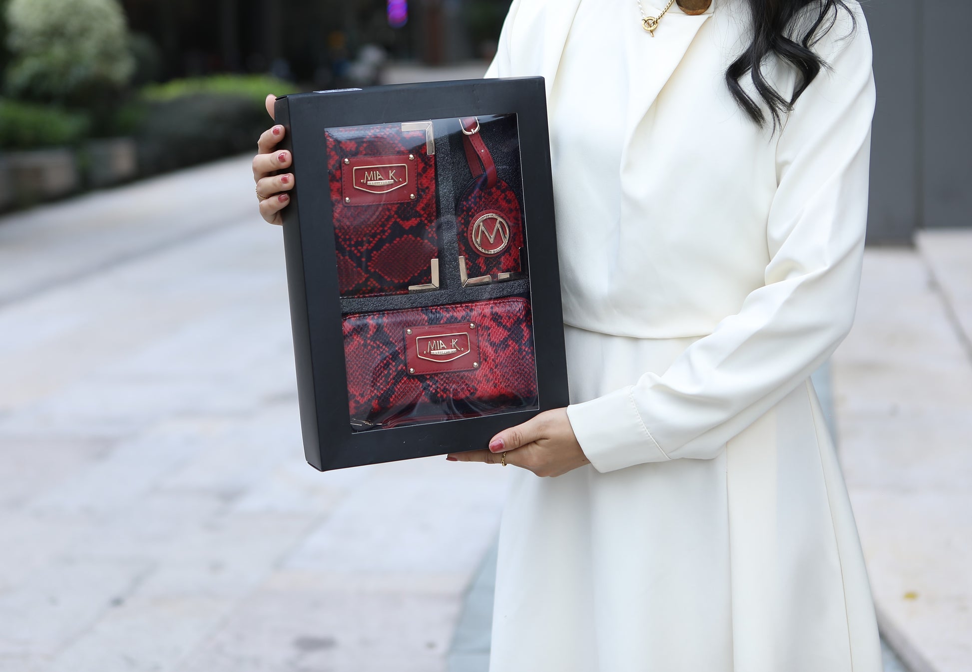- Looking for a beautiful travel gift set for someone who loves traveling? Our Darla Travel Set is the perfect gift designed to add a touch of class to your travel accessories. The set comes with a passport holder, luggage hang tag, and a wallet with plenty of space. Crafted from faux-snake embossed high-quality vegan leather, and designed with gold-tone embellishments, this set combines style with the organization.