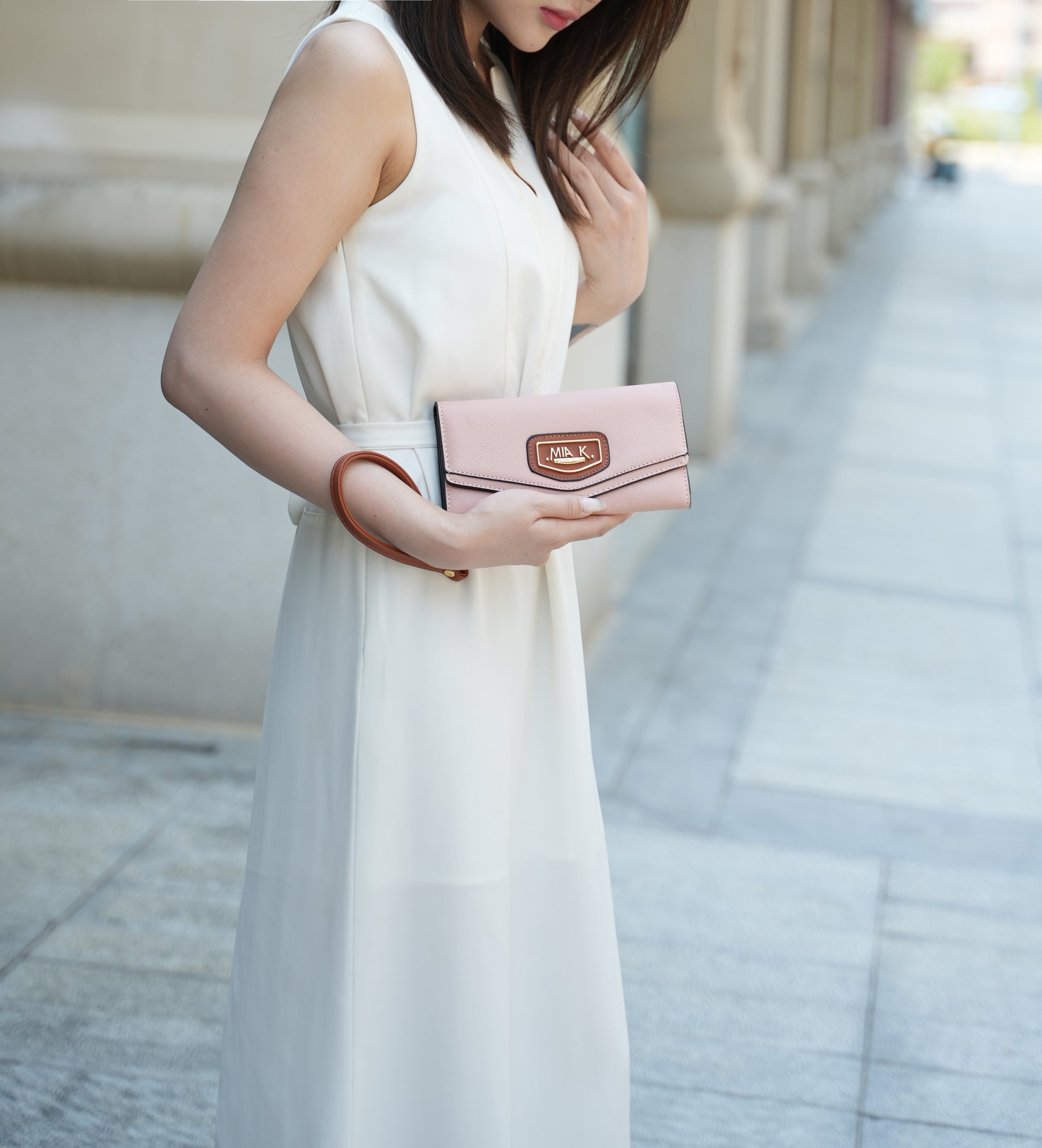 1 center zip pocket, 8 card slots, 2 slip pockets, snap button