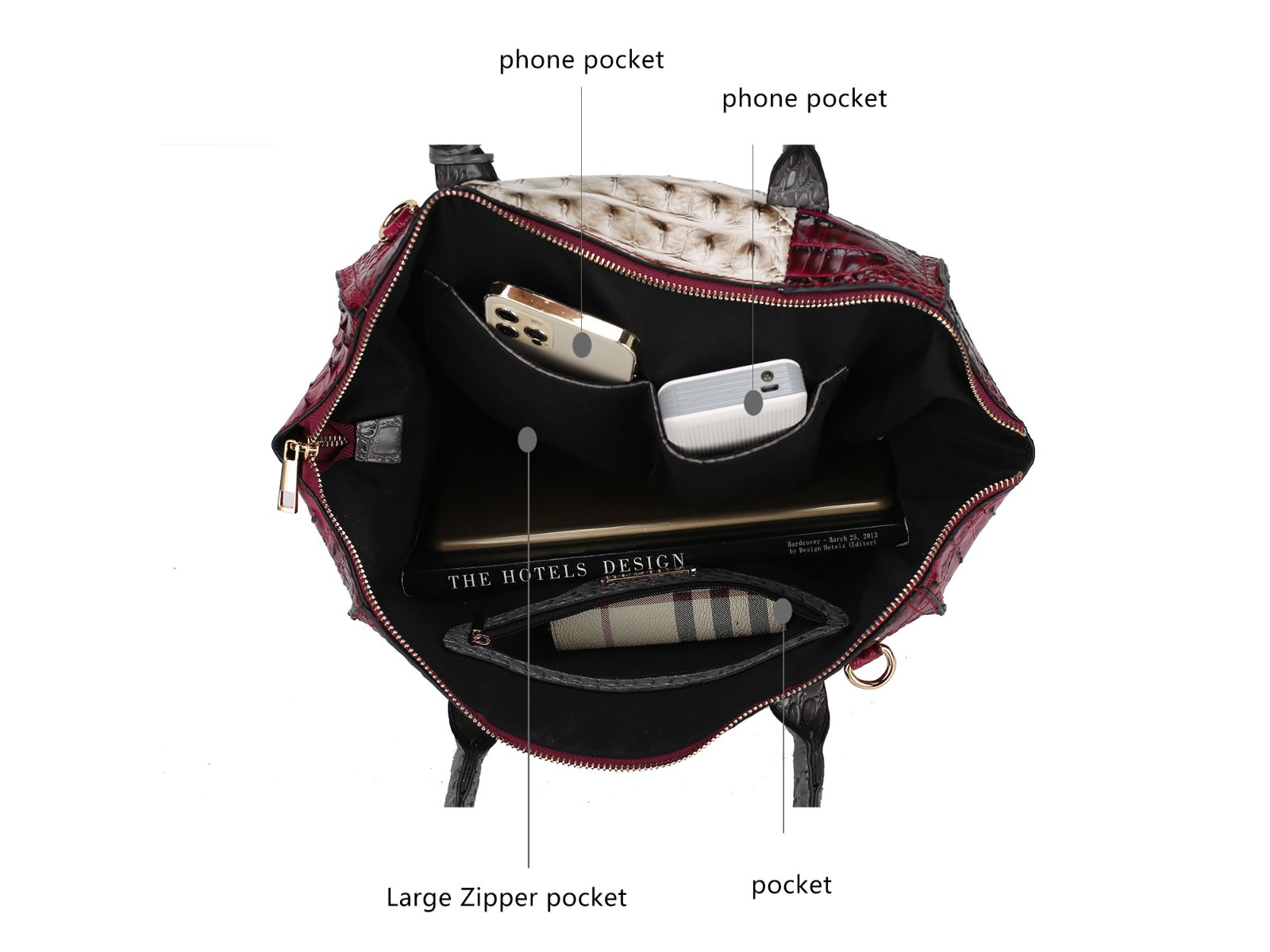 - The Ember Satchel Bag is a chic and structured carryall for every day. Crafted from faux crocodile-embossed vegan leather with a color block finish, and designed with gold-tone embellishment, this satchel is a forever bag. Open the top zipper closure to reveal a fully lined well-organized interior with dedicated pockets for your phone, wallet, and other small items. The exterior features a small ring so you can attach your keyring. Carry the Ember Satchel Bag by the top handles or attach the adjustable crossbody strap for multiple carrying options. This style has a flat base and feet for stability. You will love this both practical and polished style.