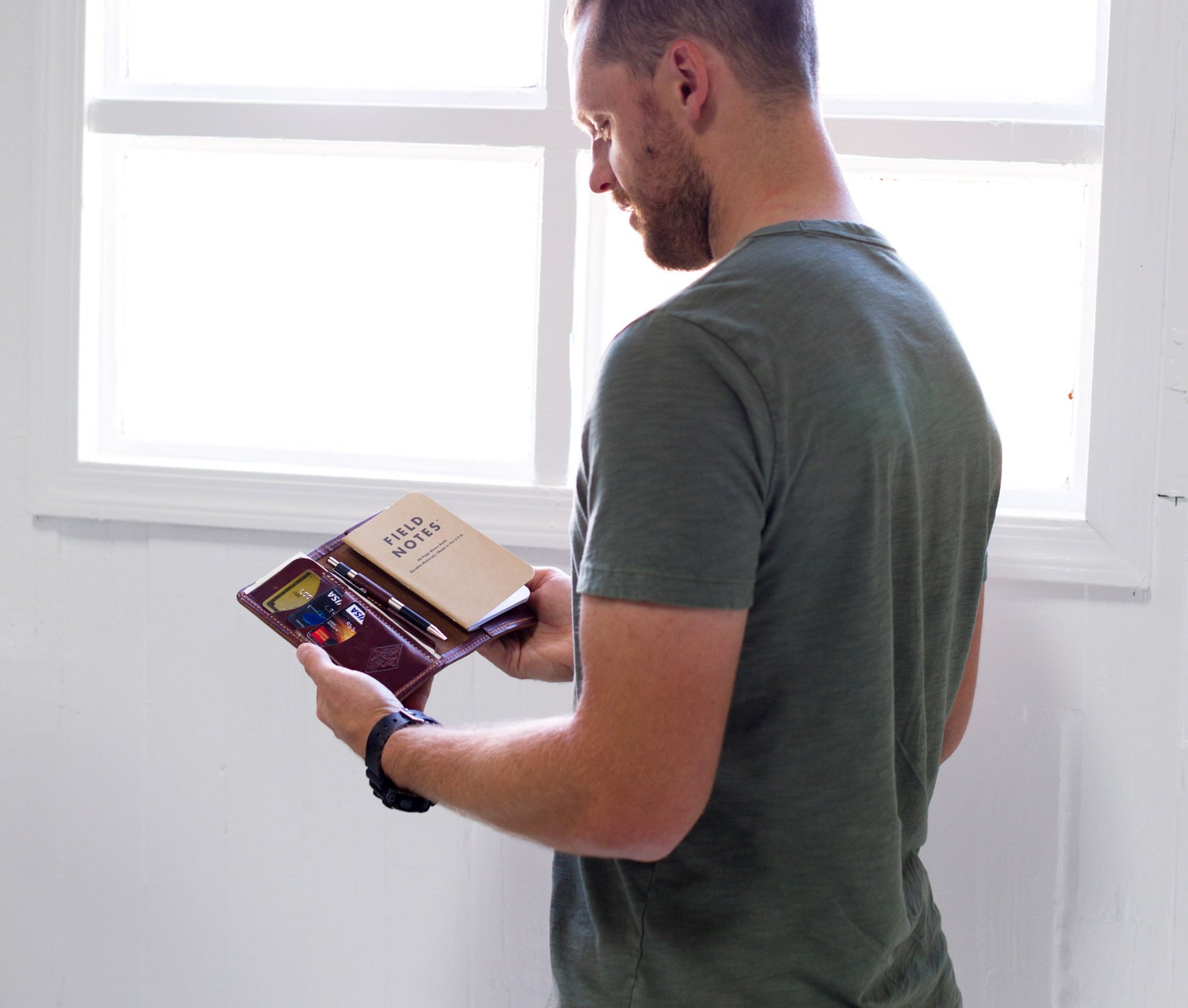 It's a wallet with purpose, thoughtfully designed with useful features like a pen loop, field notes journal, tiered card slots, and various sleeves for cash & receipts. Write down goals or jot down notes quickly, easily and securely store cards, cash, or receipts, the list goes on.