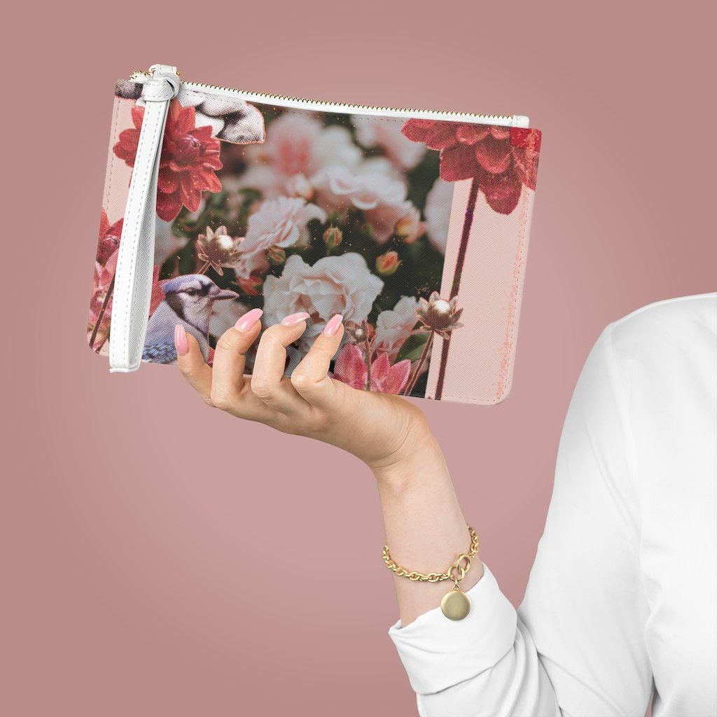 Floral Zipped Clutch Bag - Designed with a loop handle to quickly free your hands, this clutch bag is made for the fashionista on the go. It can hold everyday essentials such as a phone, wallet, and keys. It features a zip fastening and a fully lined internal pocket. It is made of vegan leather in the Saffiano pattern finish that was invented by Prada.