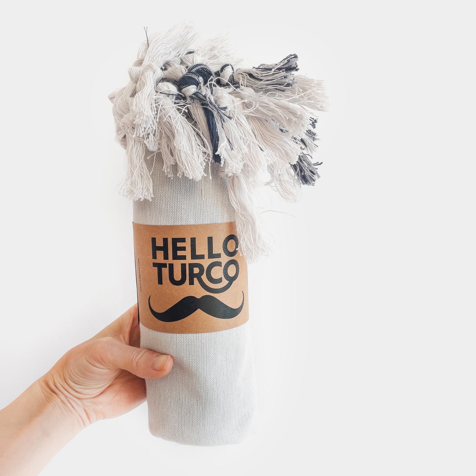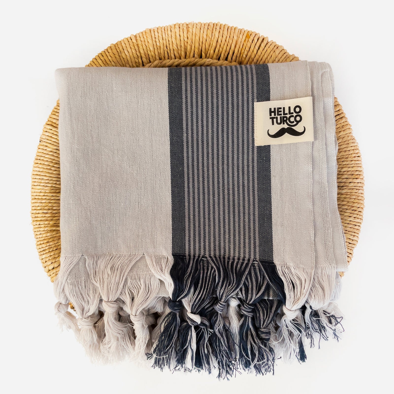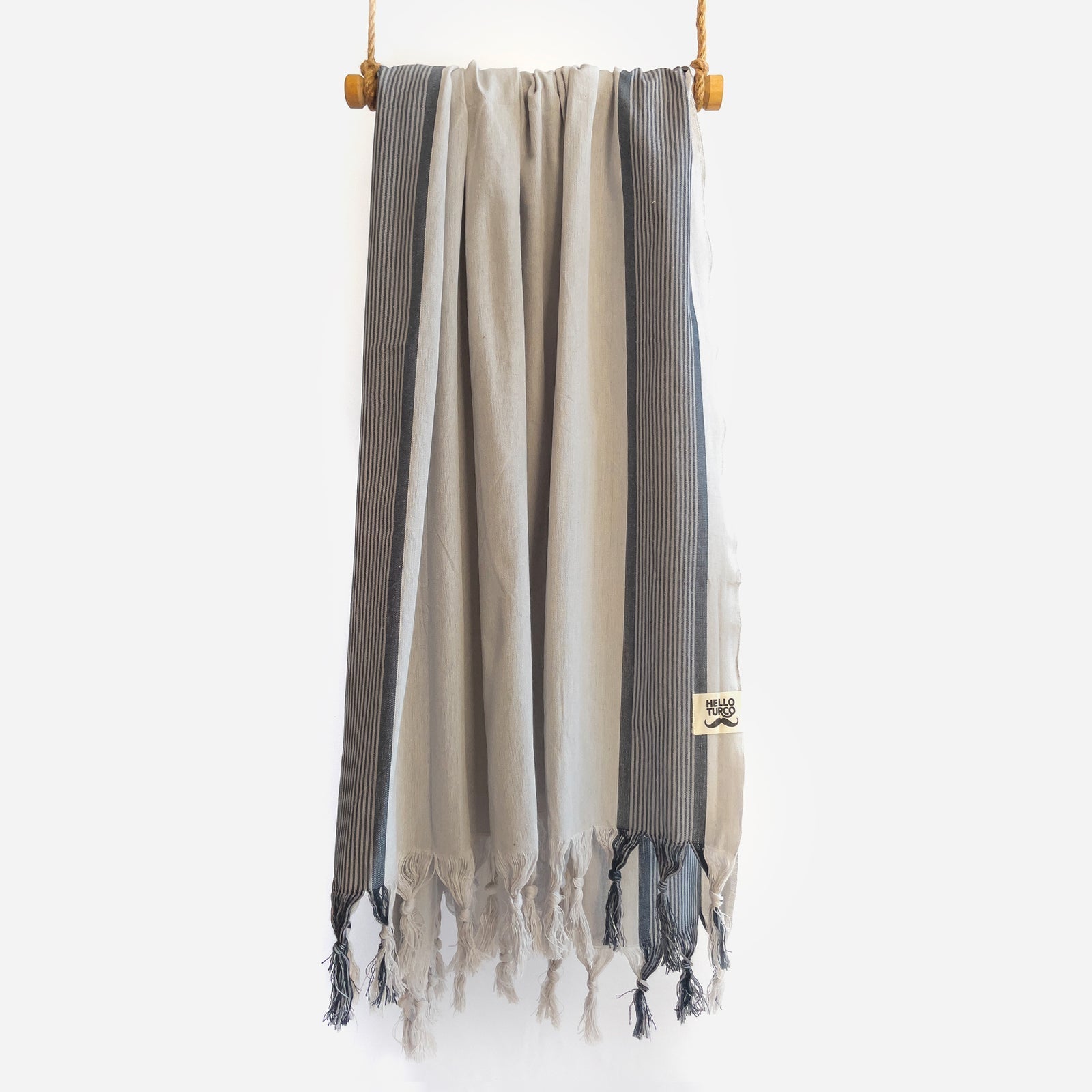 This thin, tight-knitted Turco is as light as our Beach Boys towels which makes a perfect company for travel, sports, sauna and of course beach. You'll feel the naturalness of cotton when you first touch this light gray Turkish towel. Base color is light gray and stripes are slightly pale dark blue.