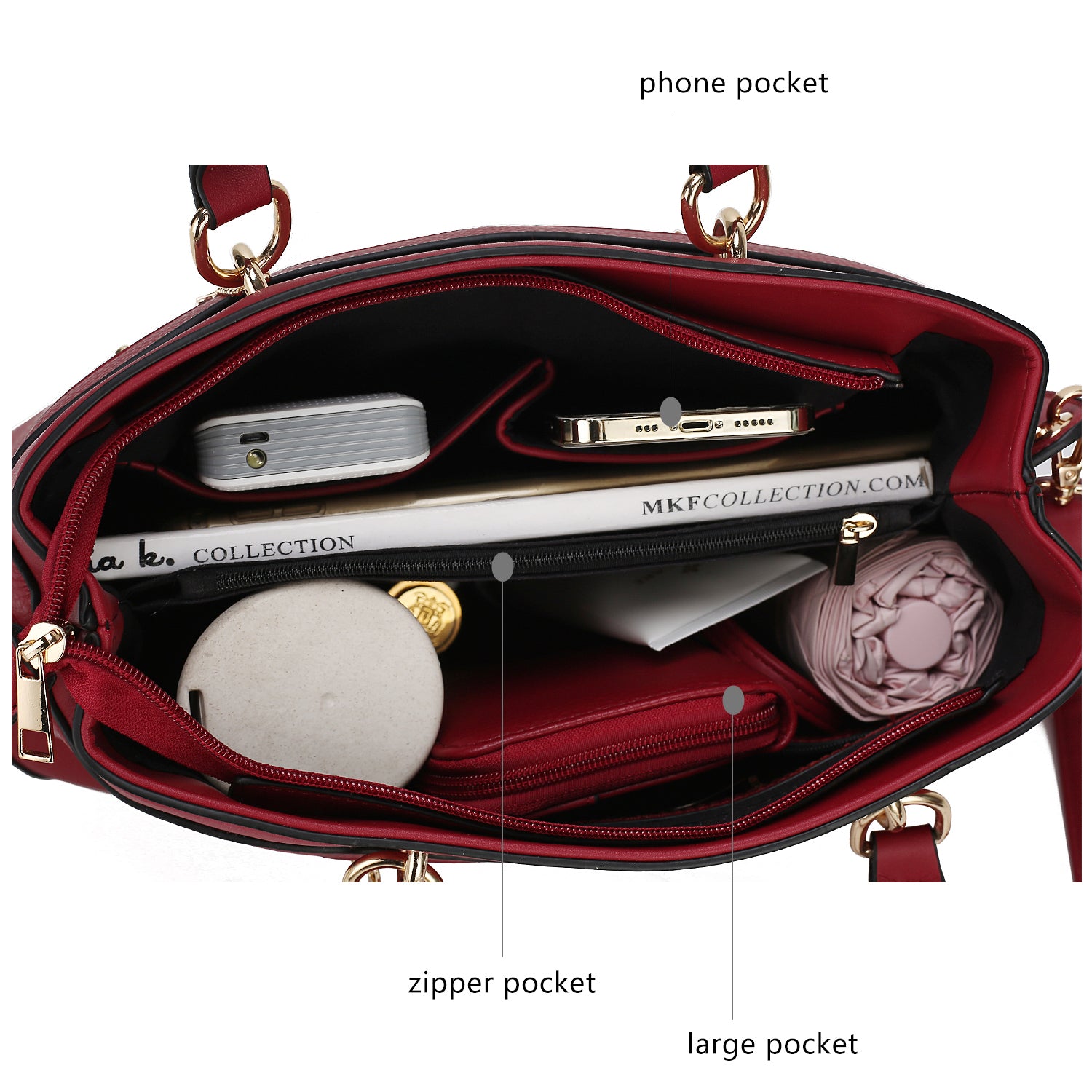 - POCKETS: Interior features a wall zip pocket, two slip pockets and a center zip compartment. Exterior features a back and front zippered pocket.