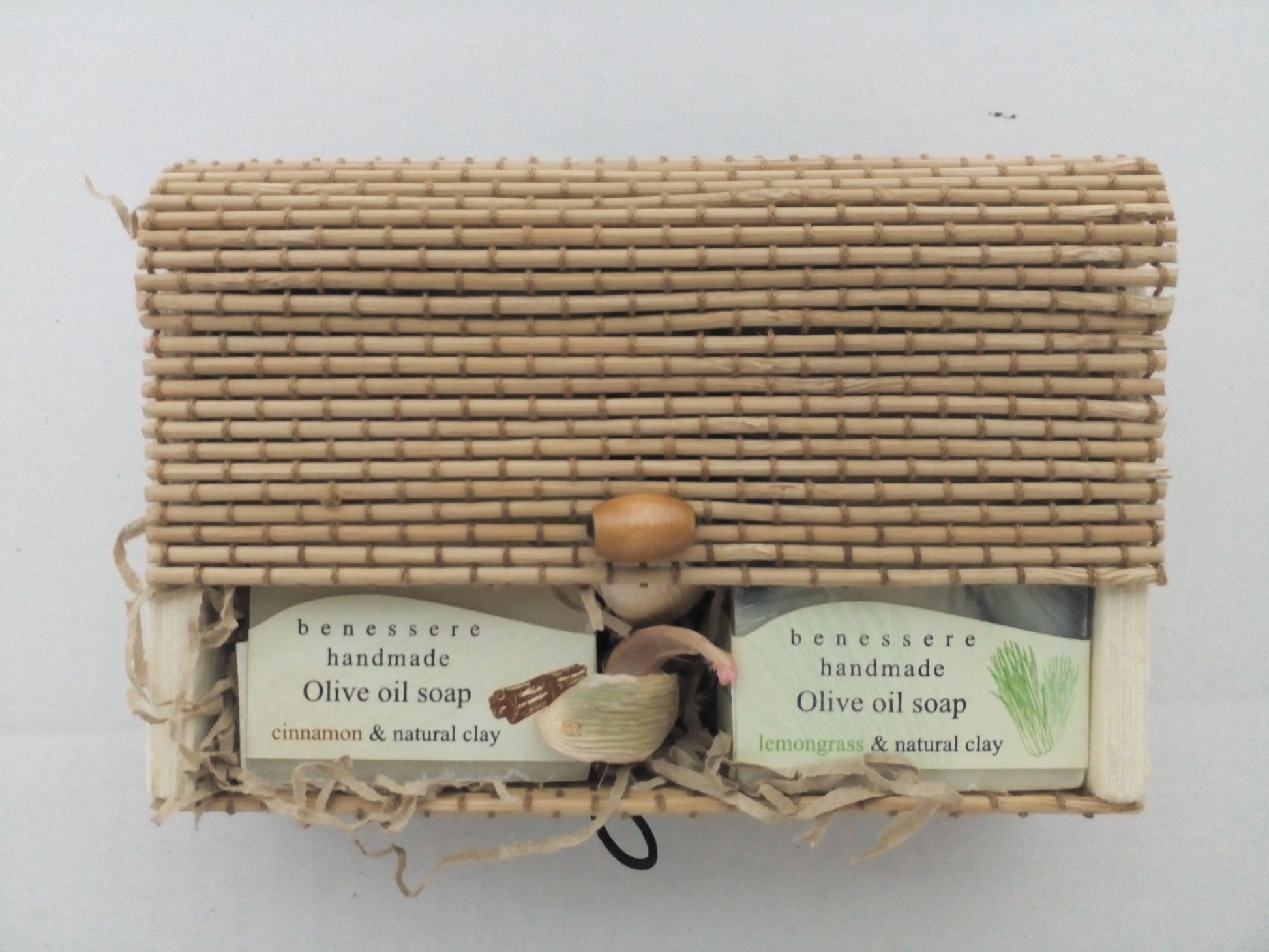 Подарочная коробка из дерева и бамбука содержит два оливковых мыла ручной работы, изготовленных из органического оливкового масла, натуральной глины и эфирных масел.