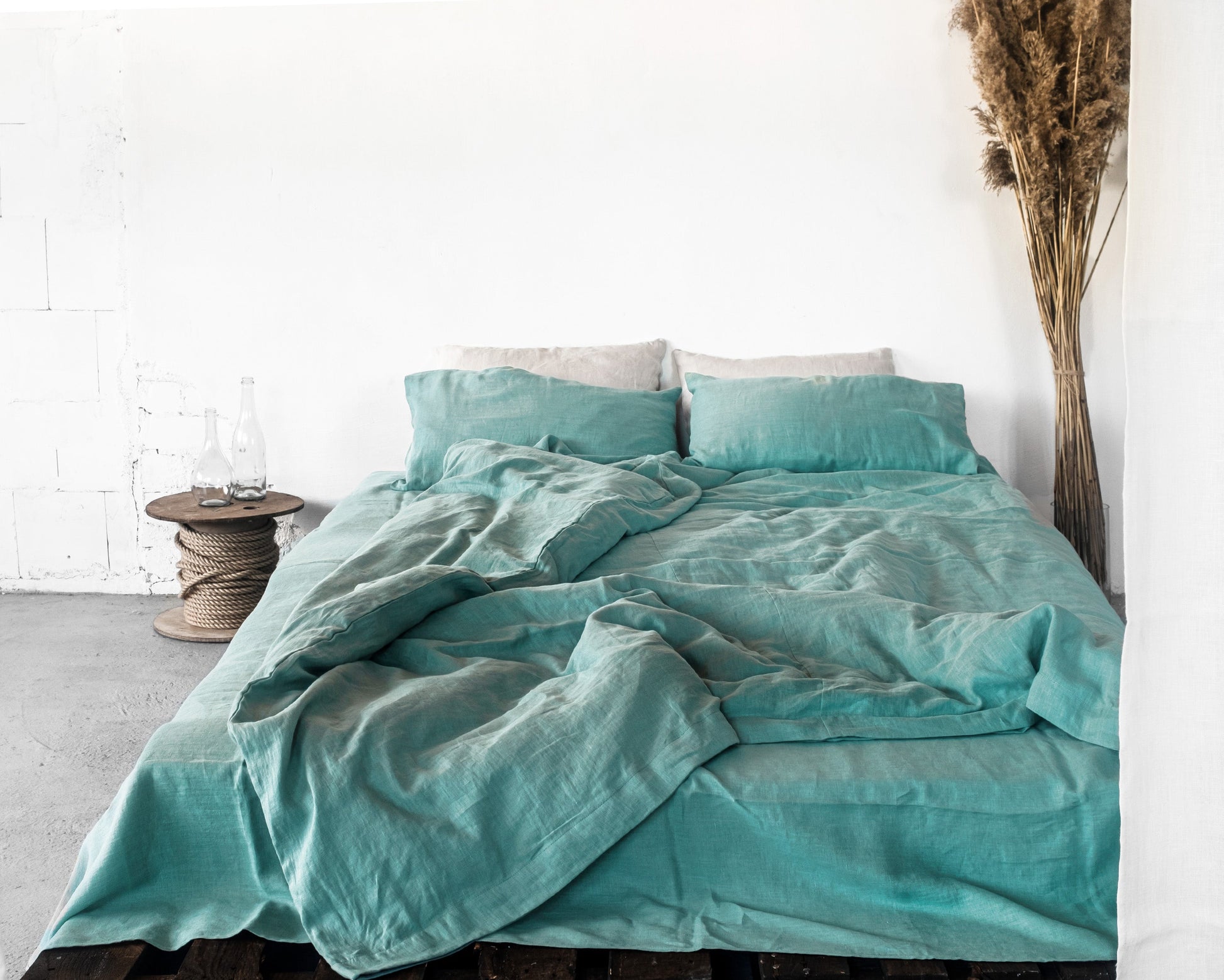 Bedding set from pure linen. The greyish mint Linen bedding set is a perfect unisex set. It will help you easily create a minimal, Scandinavian look in your bedroom and help you enjoy restful nights. Constructed out of hollow fibers, linen acts as a natural insulator, keeping you cool in the summertime and warm in the cold season. Do not hesitate to ask about matching colors and combine your own set!