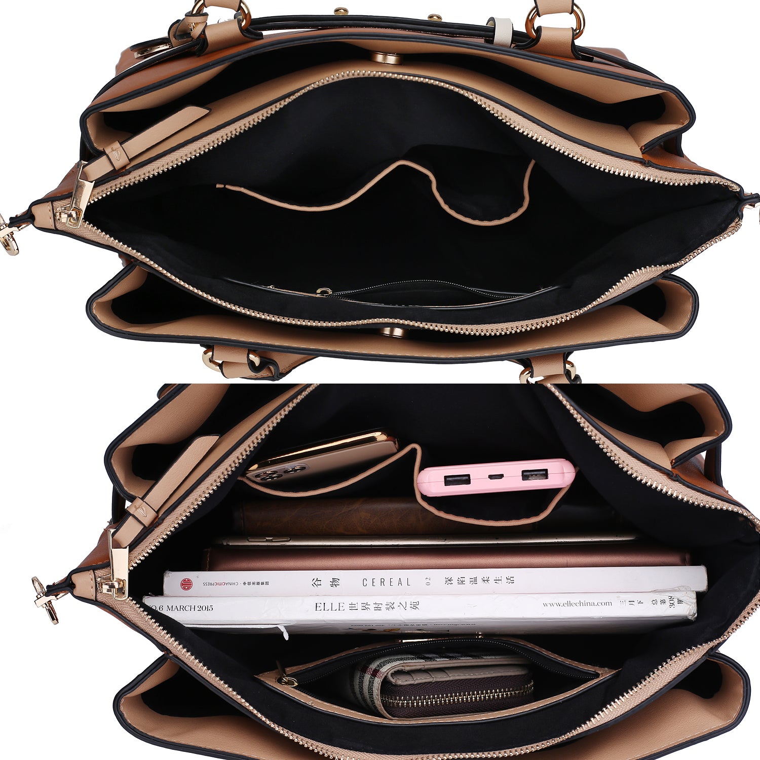 - POCKETS: Interior features three spacious compartments; a mid-centered zipper compartment with two slip-in pockets ideal for a phone or smaller items for easier access. Two snap-wide compartments