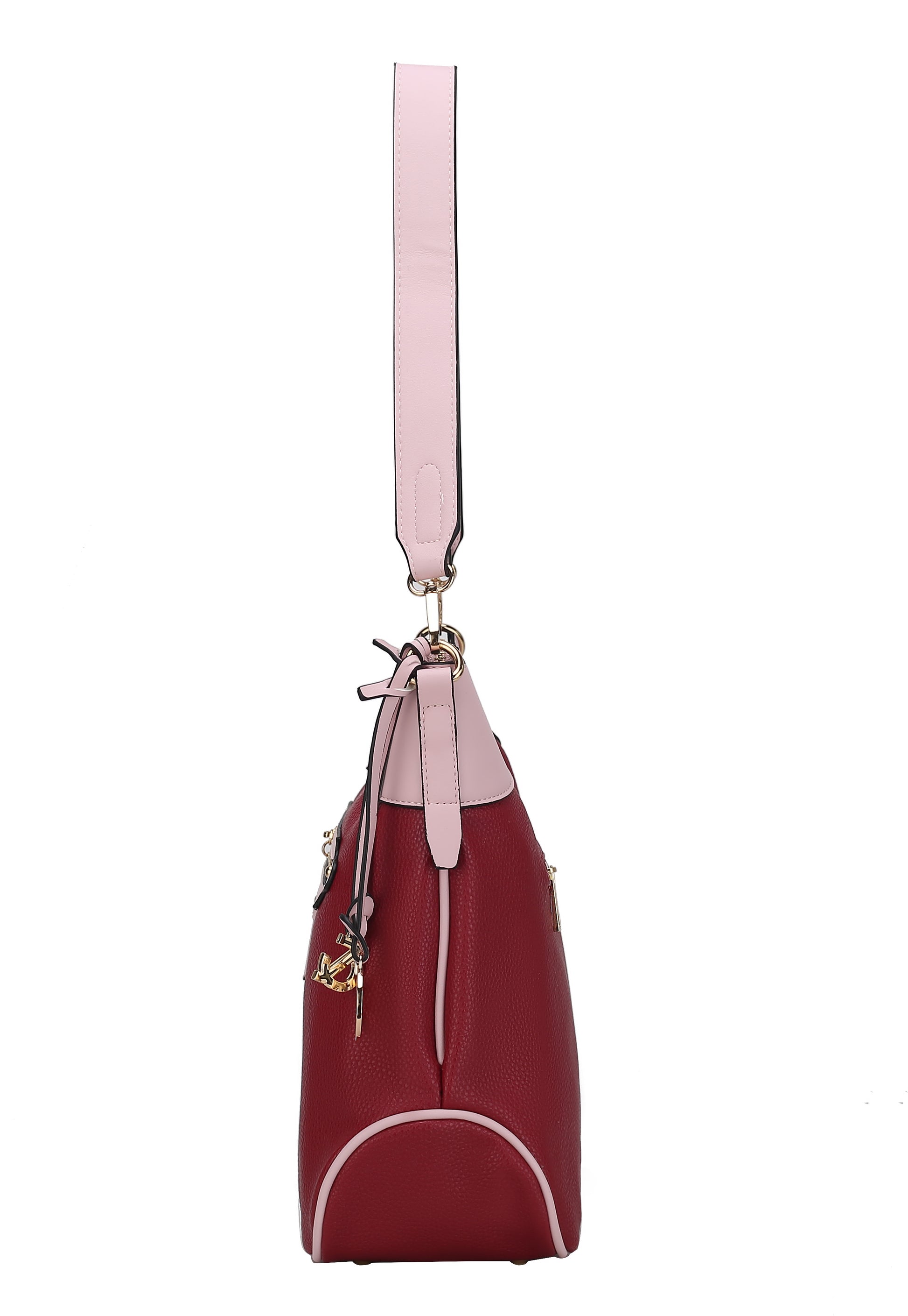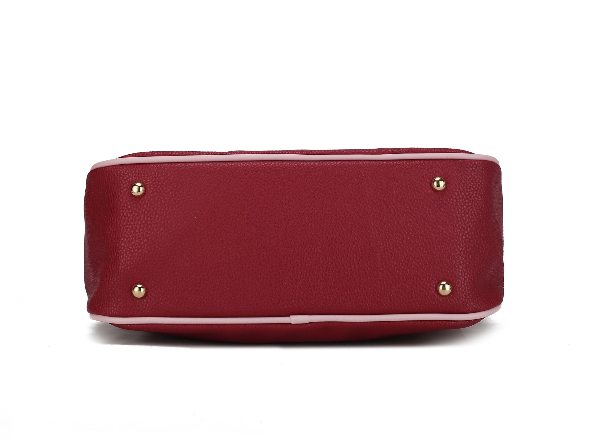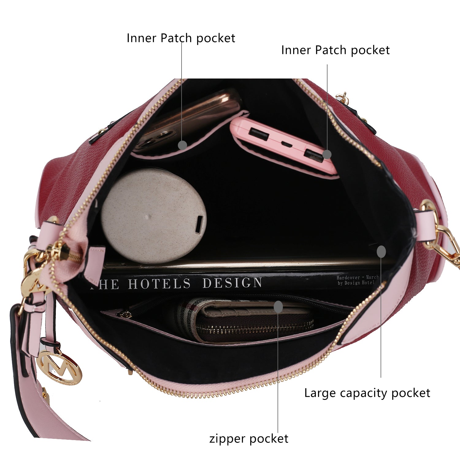 - Crafted from luxe pebbled vegan leather with a color-block finish and designed with golden-tone hardware, the Josie Shoulder bag accommodates everything you need for your busiest of days. Unzips it to reveal a fully lined spacious interior, with a wall zip pocket and two slip pockets. The exterior features convenient zippered pockets on the front and back of the bag. Wear this Bag on your shoulder or adjust the strap to style it crossbody. With a flat base for stability, the Josie Shoulder Bag has feet on it to keep the bag upright position. It has our signature “M’ and “&” emblem attached in a string for decoration. The Josie Shoulder Bag comes with a matching wallet with a wristlet.
