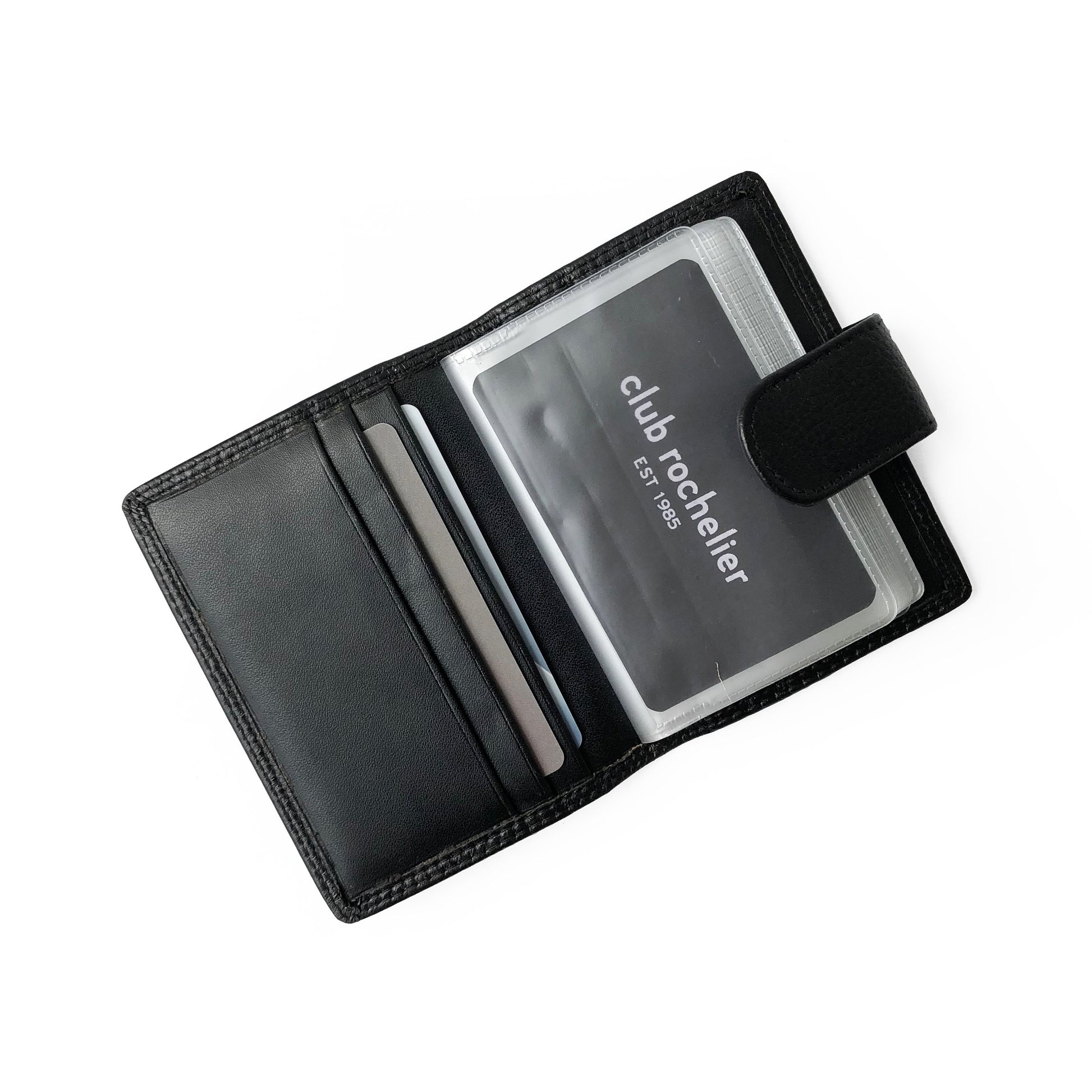 Club Rochelier's Jumbo Card Holder is a fantastic accessory. Featuring 6 credit card slots and a multi pocket plastic insert for more credit cards and ID. Small, convenient and very functional. Available in red, and black