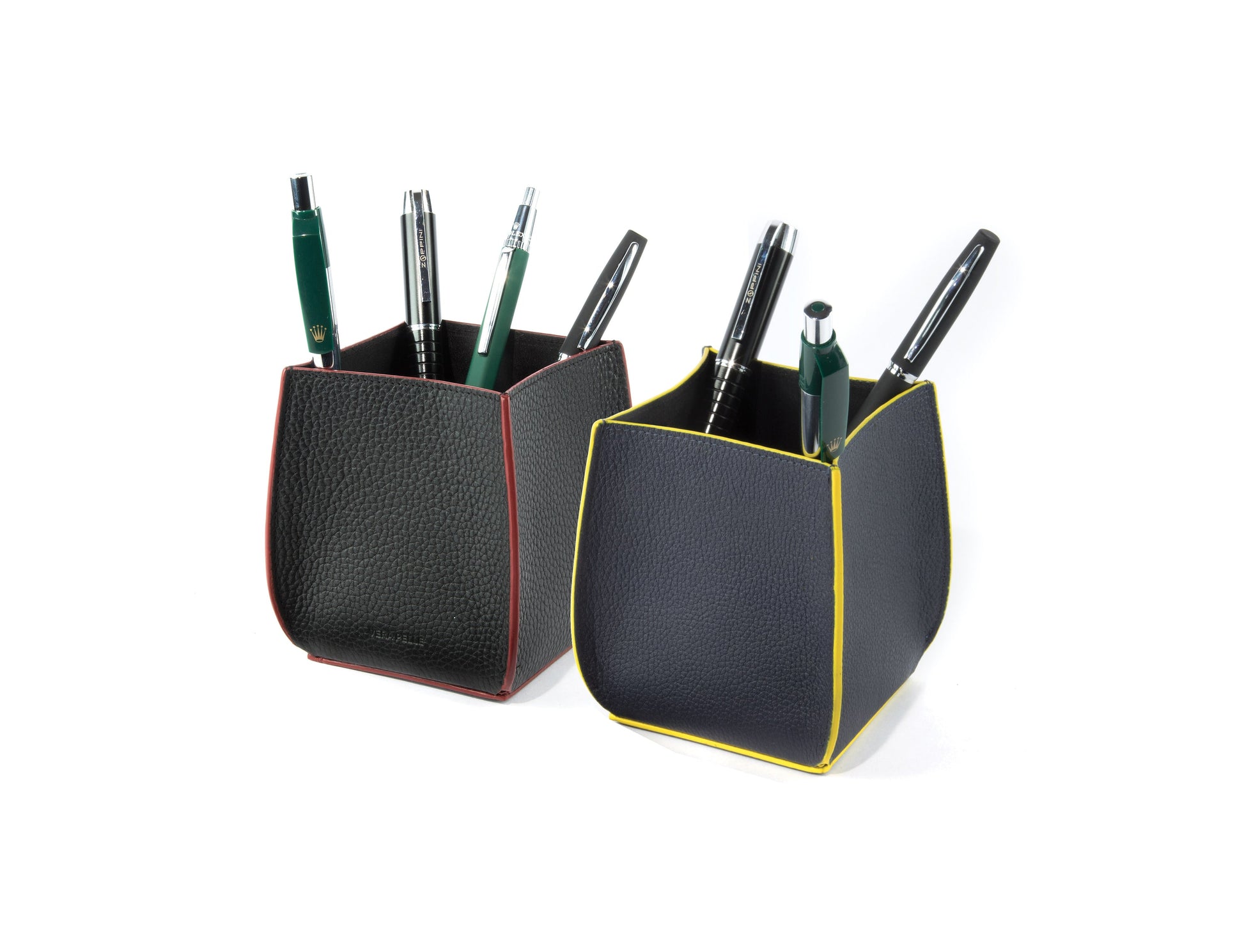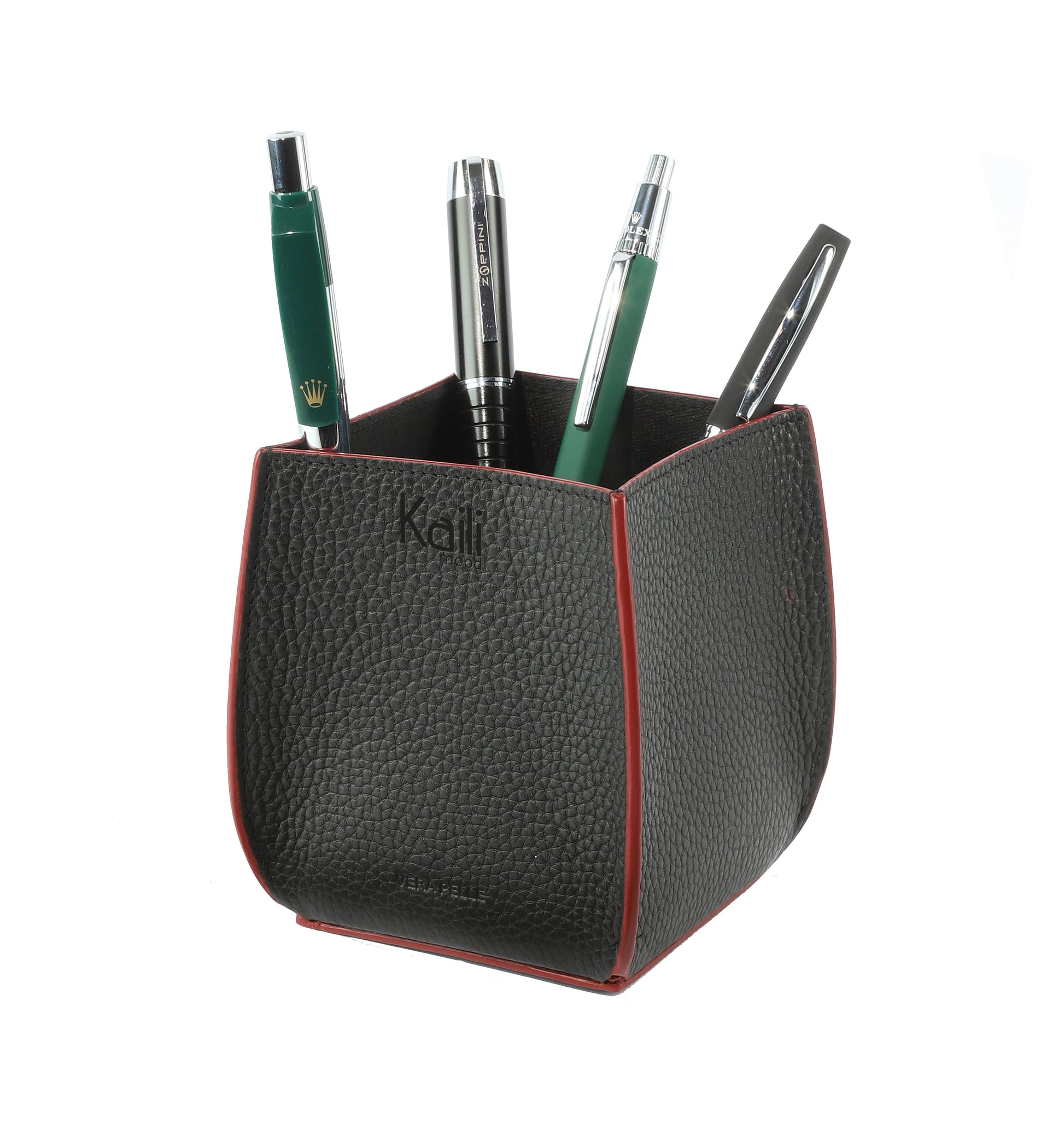 Il Porta Penne da Scrivania è un prodotto in Vera Pelle disegnato in Italia e realizzato artigianalmente ed interamente con un pellame di primissima qualità. Il colore Nero accentua il suo stile Classico e Elegante i Bordi Rossi ne delineano la silhouette. Le Dimensioni: cm 8.5 x 8.5 x 12 sono l’ideale per contenere le tue penne preferite senza essere troppo ingombrante. Il Porta Penne da Scrivania in Scatola regalo fondo/coperchio si presta per un perfetto regalo Premium.