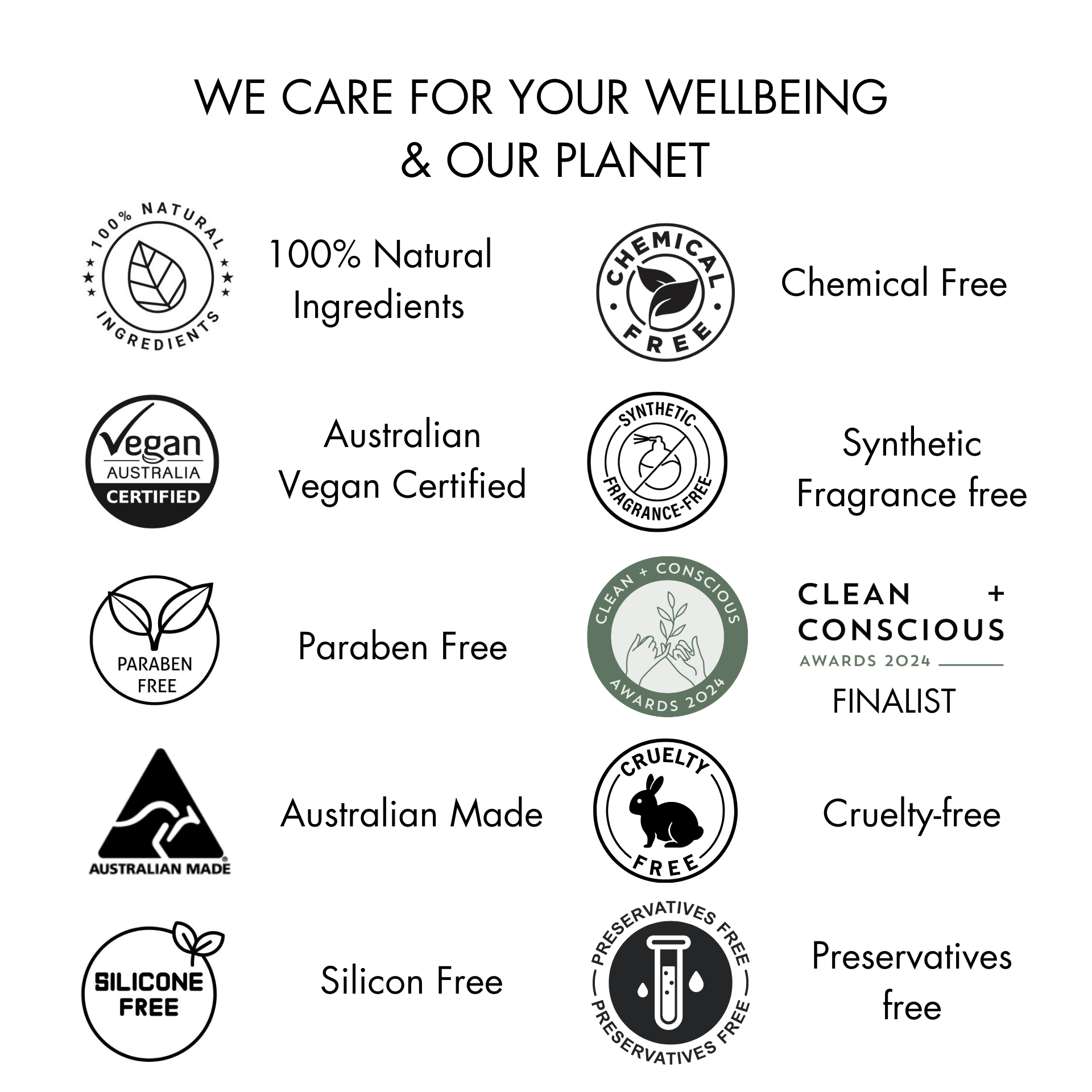 Organic Simmondsia Chinensis (Jojoba) Seed Oil, Organic Camellia Seed Oil, Organic Oenothera Biennis (Evening Primrose) Oil, Citrullus Lanatus (Watermelon) Seed Oil, Tocopherol (Vitamin E Oil Natural) , Organic Rosa Damascena (Rose) Flower Oil, Citrus Aurantium Amara (Neroli) Flower Oil, Organic Rosmarinus Officinalis (Rosemary) Leaf Oil, Organic Chamomilla Recutita (German Chamomile) Oil, Organic Citrus Aurantifolia (Lime) Oil, Organic Citrus Medica Limonum (Lemon) Peel Oil, Lavandula Angustifolia (Lavender) Flower Oil