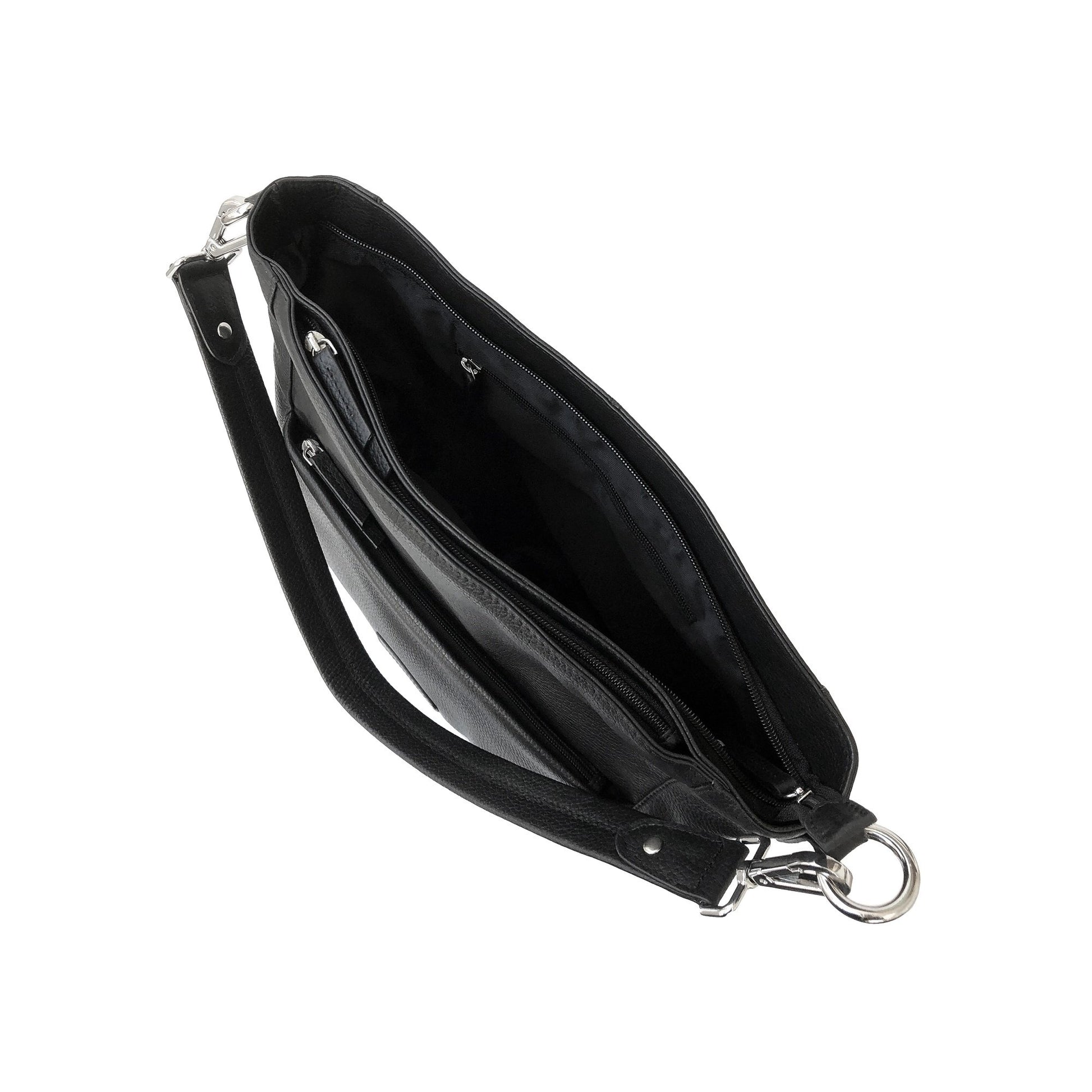 Застежка-молния сверху, дополнительный карман на молнии сверху, карман на молнии спереди, съемный плечевой ремень длиной 10 дюймов (26 см), регулируемый и съемный плечевой ремень длиной 14 дюймов (36–27 дюймов (69 см), внутренний карман на молнии на стене, блестящая серебристая фурнитура, мягкая на ощупь натуральная кожа, черная подкладка.