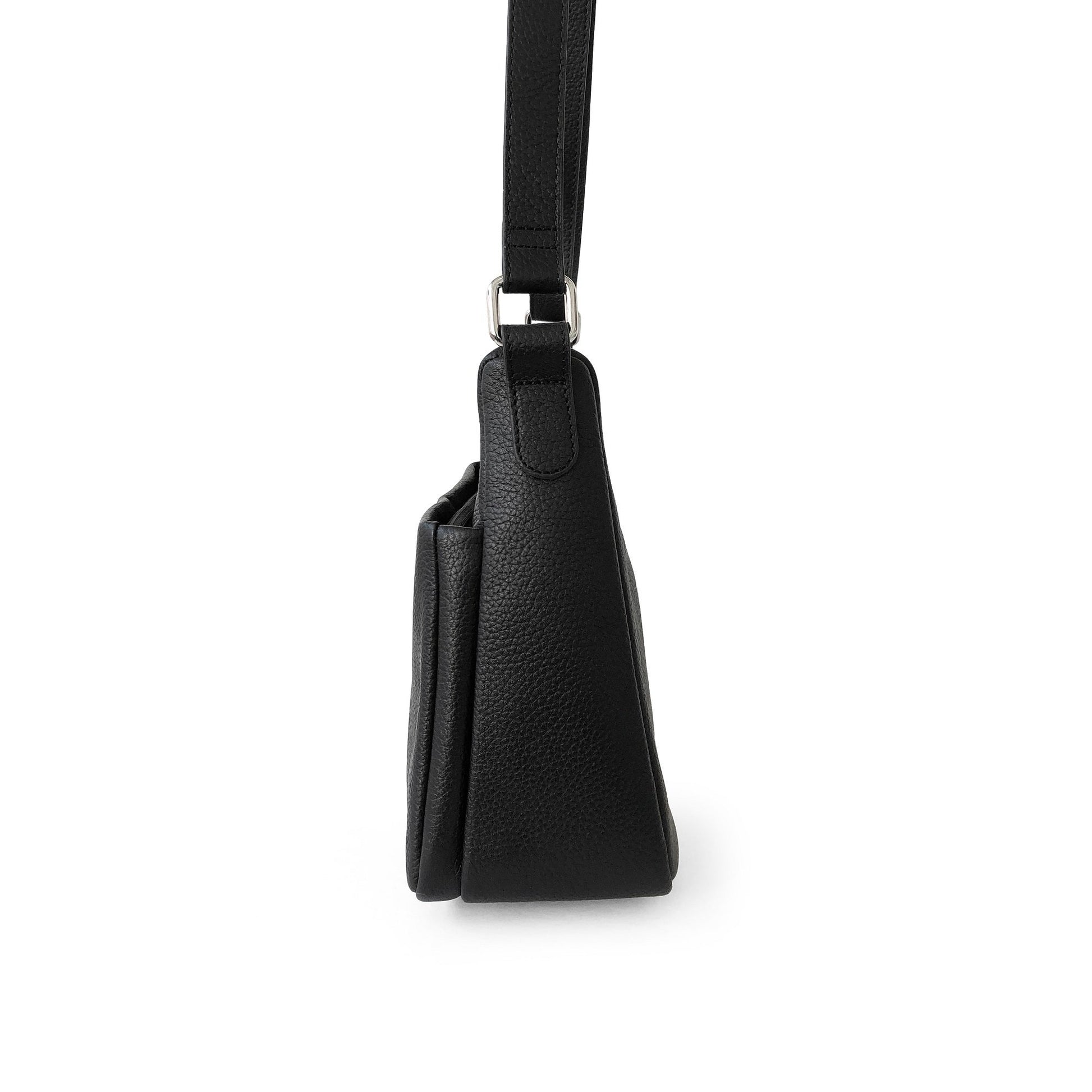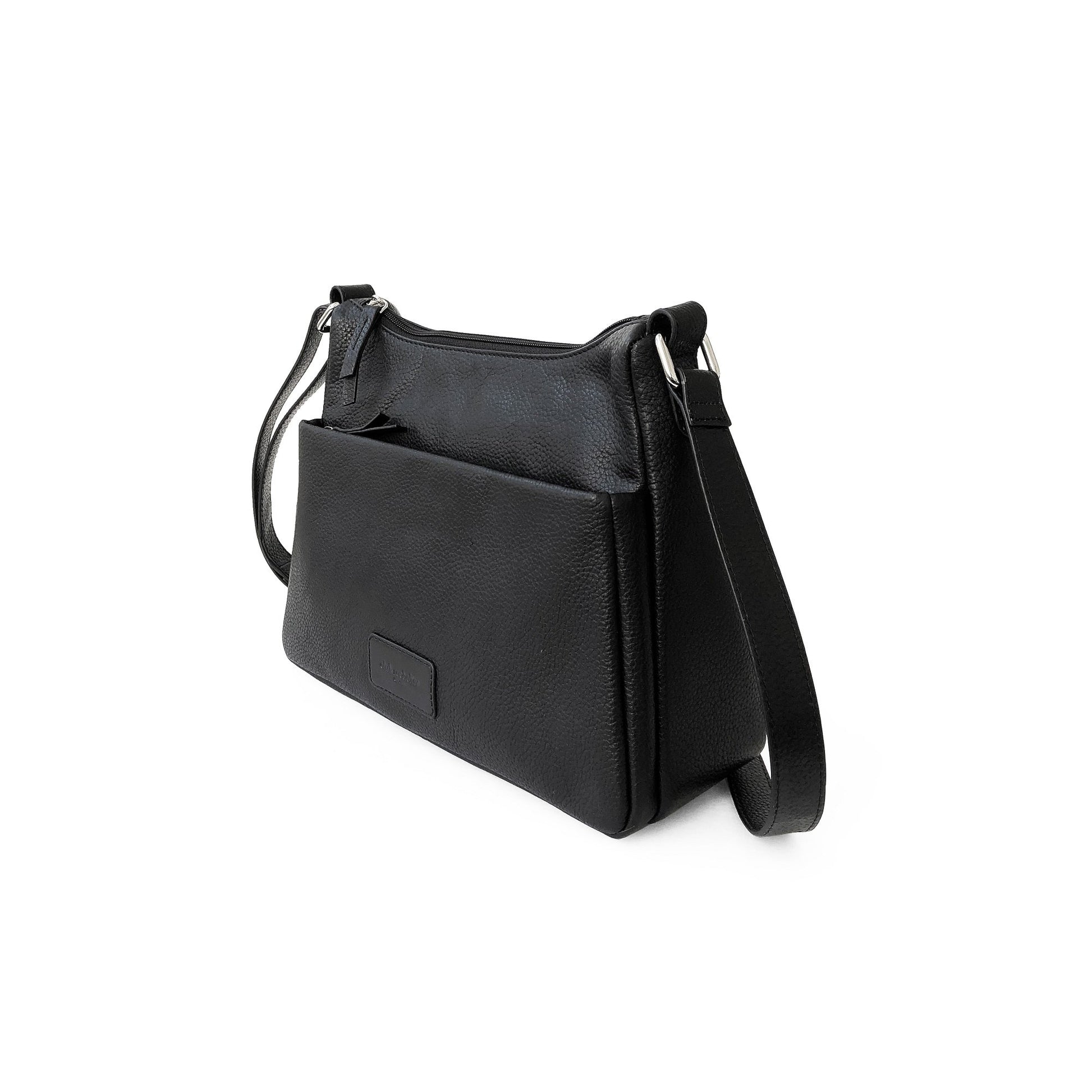 Top zip closure, front zipper pocket, 14"(36cm)-27"(69cm) adjustable shoulder strap, interior zippered wall pocket, shiny silver hardware, soft touch genuine leather, black lining.