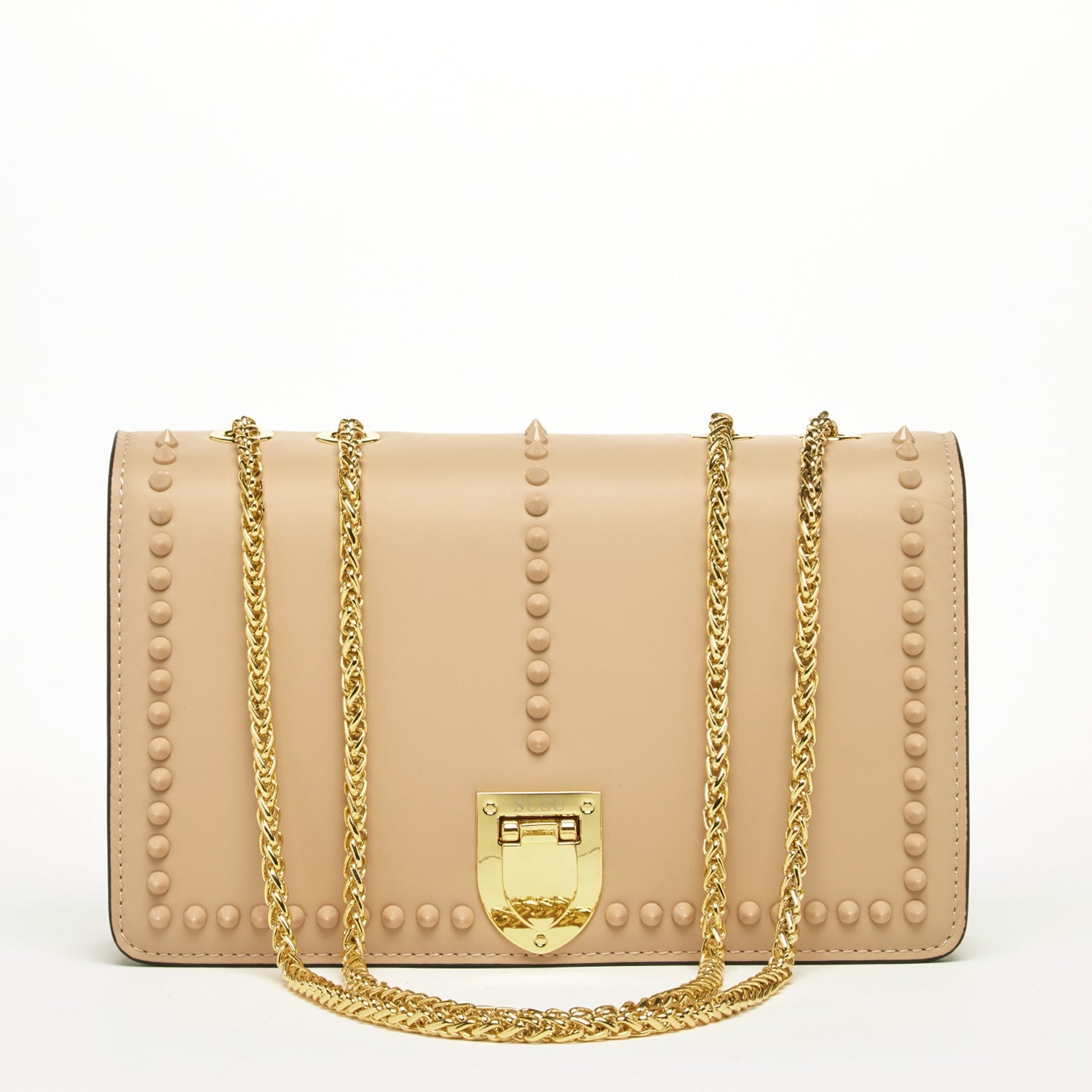 The Josie will take you through the seasons looking trés chic. Made with smooth leather, this trendy forward beige leather purse features decorative leather studs on its front flap. With a buckle closure, the fabric-lined interior includes a zip pocket, cell phone slip and 6 credit card slots. Its gold chain strap can be worn long as a stylish crossbody or doubled up for a shorter shoulder bag style. The fashionable Josie worn day to night for all occasions.