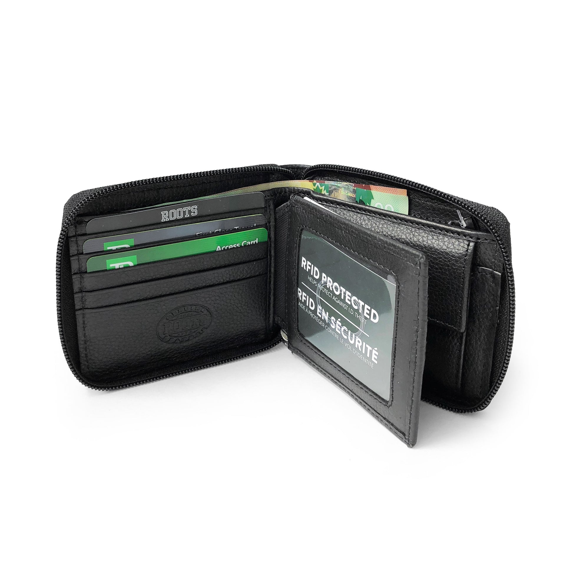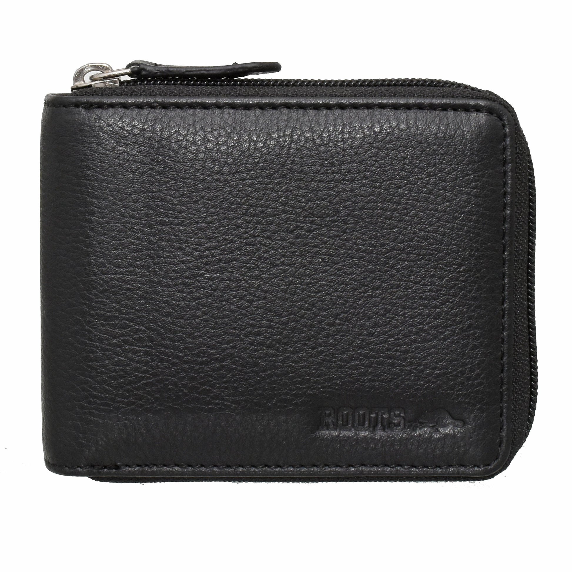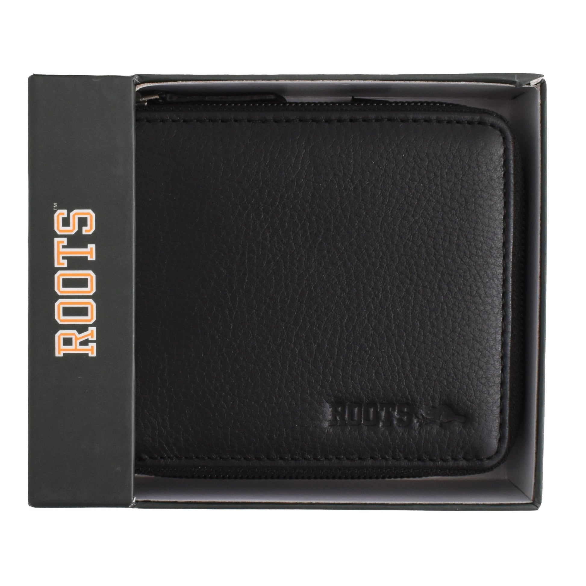Uniquely styled with a secured 3 way zip closure this soft-touch milled leather wallet by ROOTS is a classic and functional design. Open up the secured zipper closure and you will find multi functional pockets that will hold credit cards, receipts, ID and so much more. This wallet also features a gusseted coin pocket. Everything you need for a complete and organized wallet.