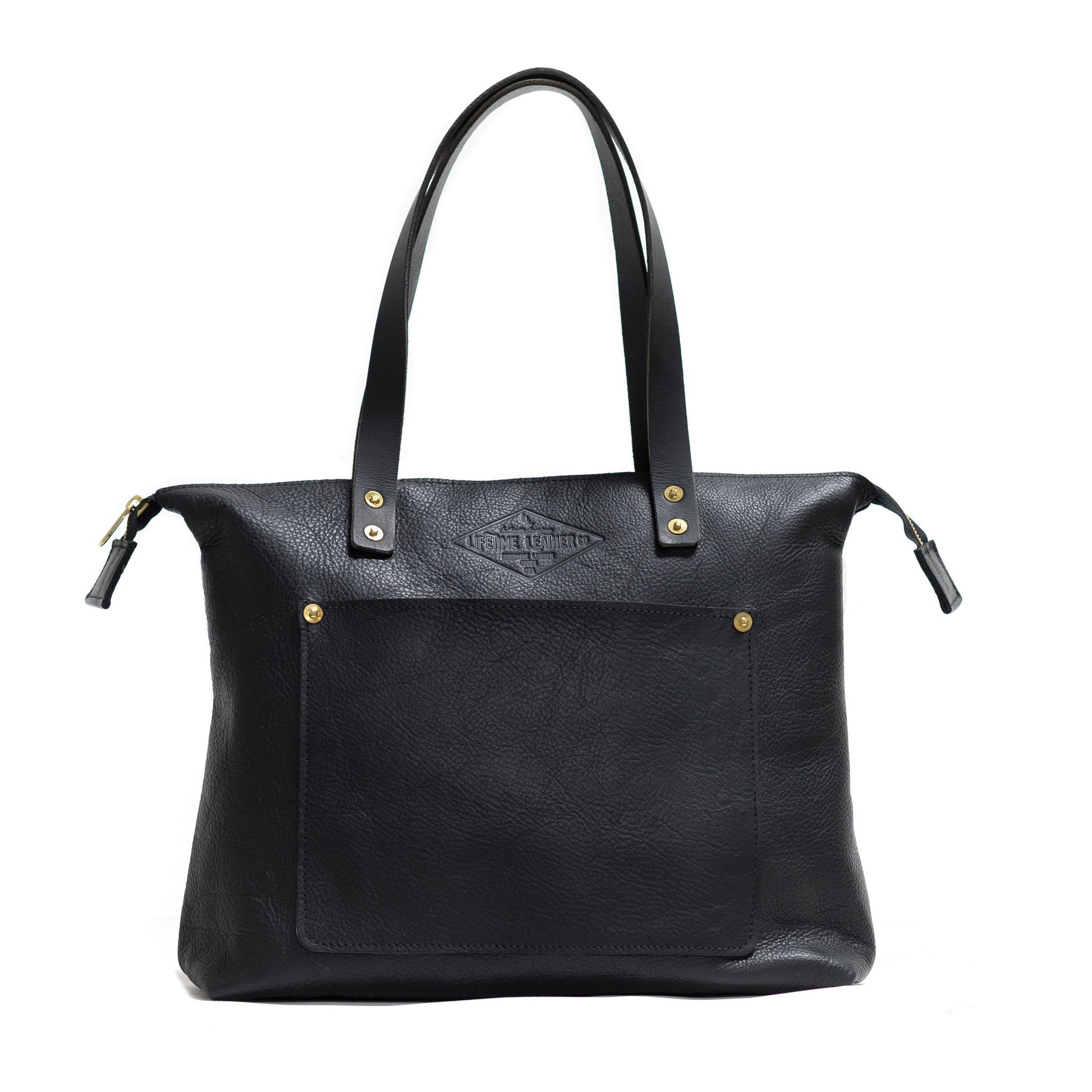 This tote comes a zippered top, an optional front pocket and (2) interior pockets (1 open pocket, 1 zippered pocket). The leather we use on this tote is softer and has a pebbled texture.