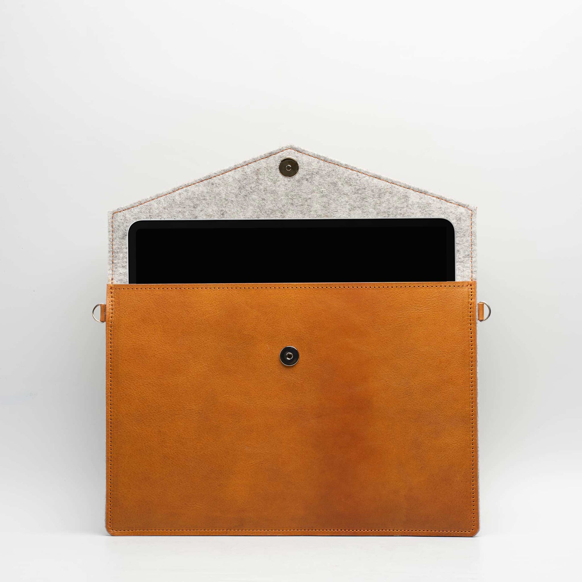 Premium leather sleeve lined with 100% wool felt for better protection. Made from full-grain vegetable-tanned leather that will develop a patina over time of use. Has an adjustable strap on carabiners with a maximum length 51 in / 130 cm.