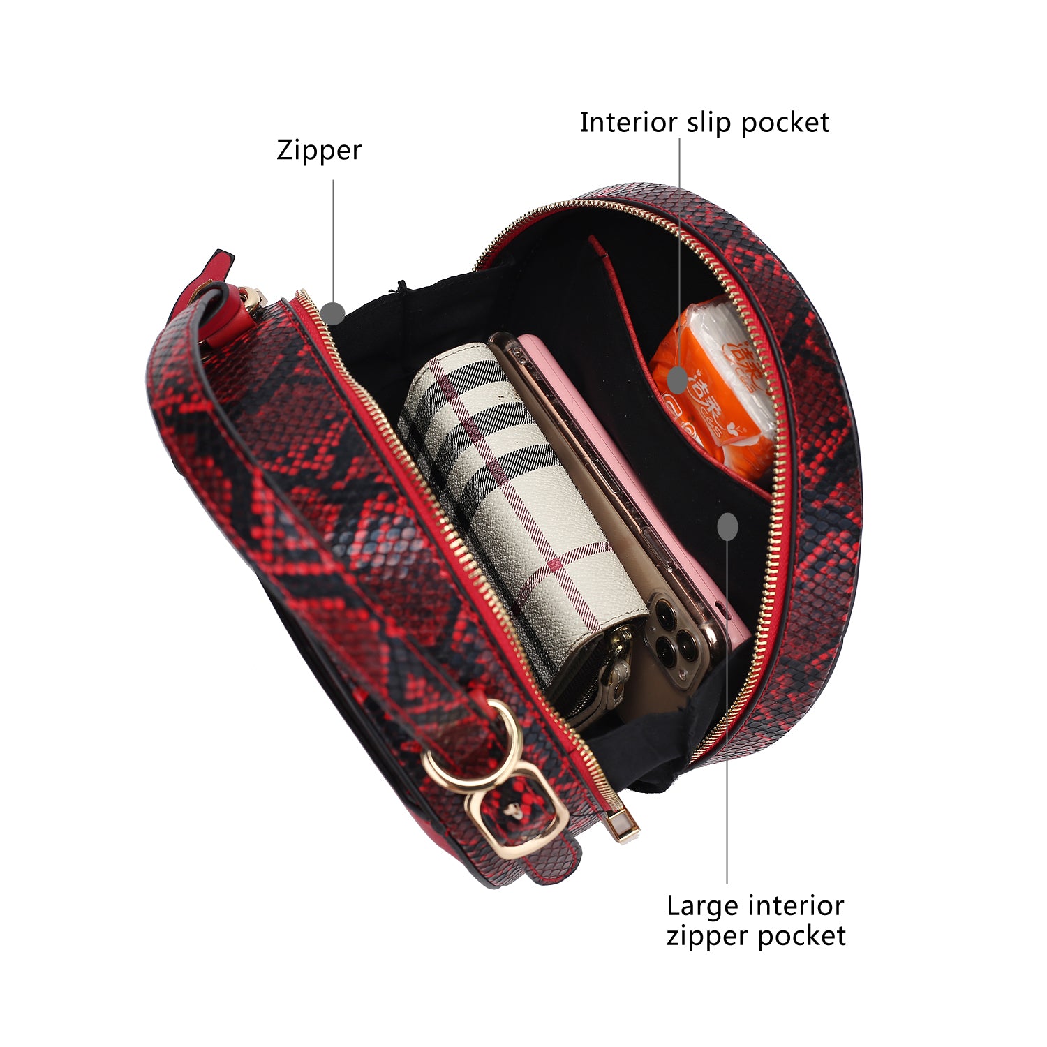 - FEATURE: Design with Luxurious gold tone embellishments. The Mallory Cross-body is everyone favorite everyday cross-body, The Mallory Cross-body is a circle one-compartment style, is a top zipper closure for your safety and amazing top handles, The Mallory Cross-body is two-tone matching material style Snake and Matching Trim. This style is hand-painted edges, has an adjustable strap making it very comfortable to expend however long you desire. Has our signature metal emblem in the front for decoration.