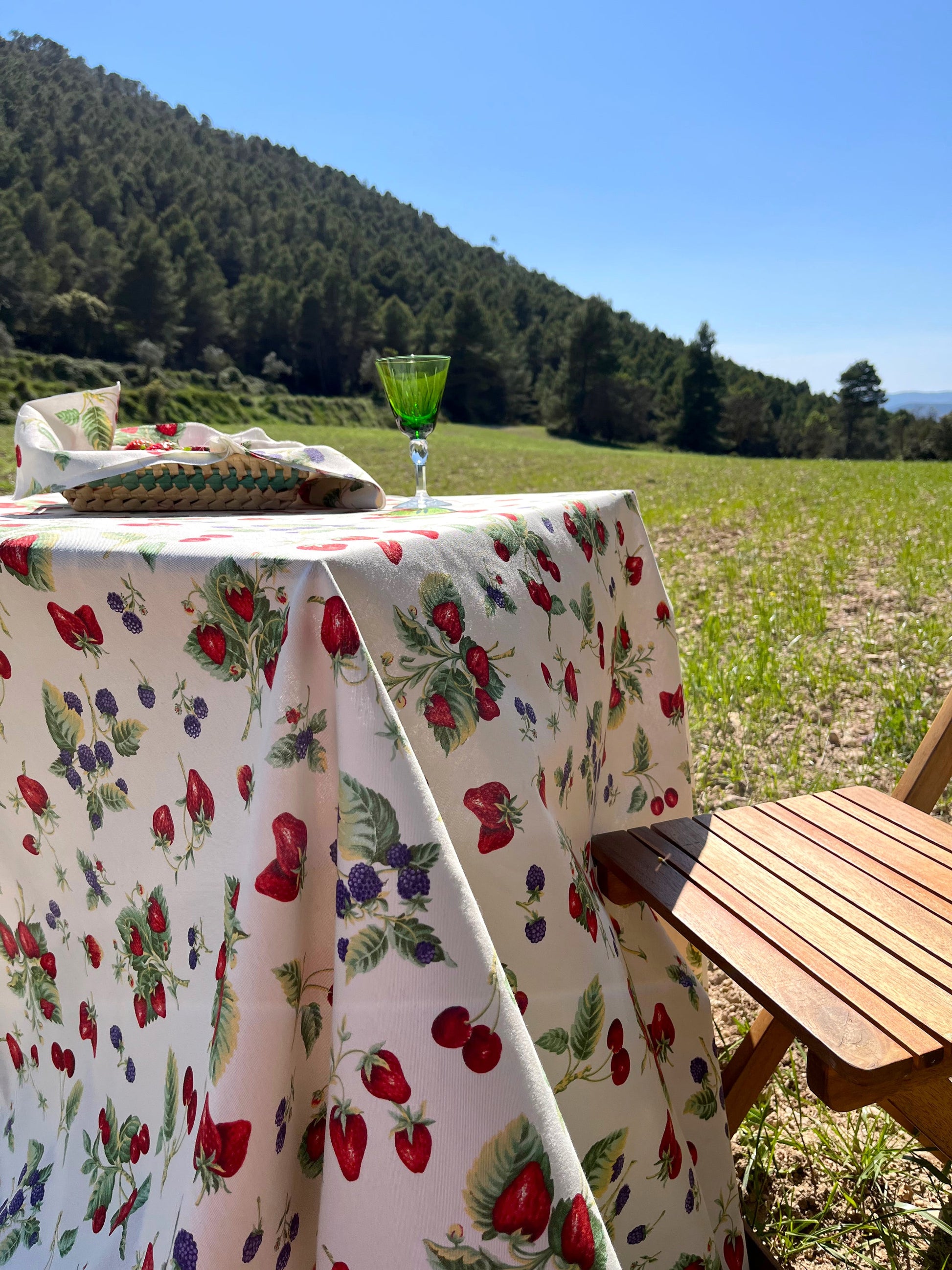 Mantel con estampado variado de frutas para mesa de interior o exterior. Mantel para comedor de diseño, 100% de algodón natural de alta calidad que ofrece modernidad y suavidad a su mesa. Diseño hermoso y discreto con el que proteger su mesa.