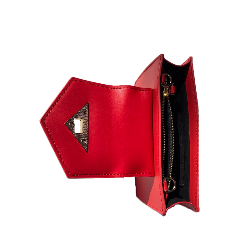 The Mary is a modern, geometric take on the classic mini crossbody bag leather wristlet. With a boxy structure and a sturdy, angular flap, this bag’s put together look will serve as a boost to your confidence. Composed of show stopping bold red leather, you are sure to feel stylish with the Mary on hand. A twist lock is placed sleekly within a statement piece of gold accent hardware to keep the flap in place. The sharp angles throughout the design of the bag contribute to its refined look. This small red leather crossbody bag is accompanied by a luxurious gold chain as well as a wrist strap so you can wear it multiple ways. The Mary is a simultaneously a crossbody and wristlet that is perfect for keeping all your essentials organized with one zipper pocket and 6 credit card slots. Its spacious interior fits even the largest smartphone models.