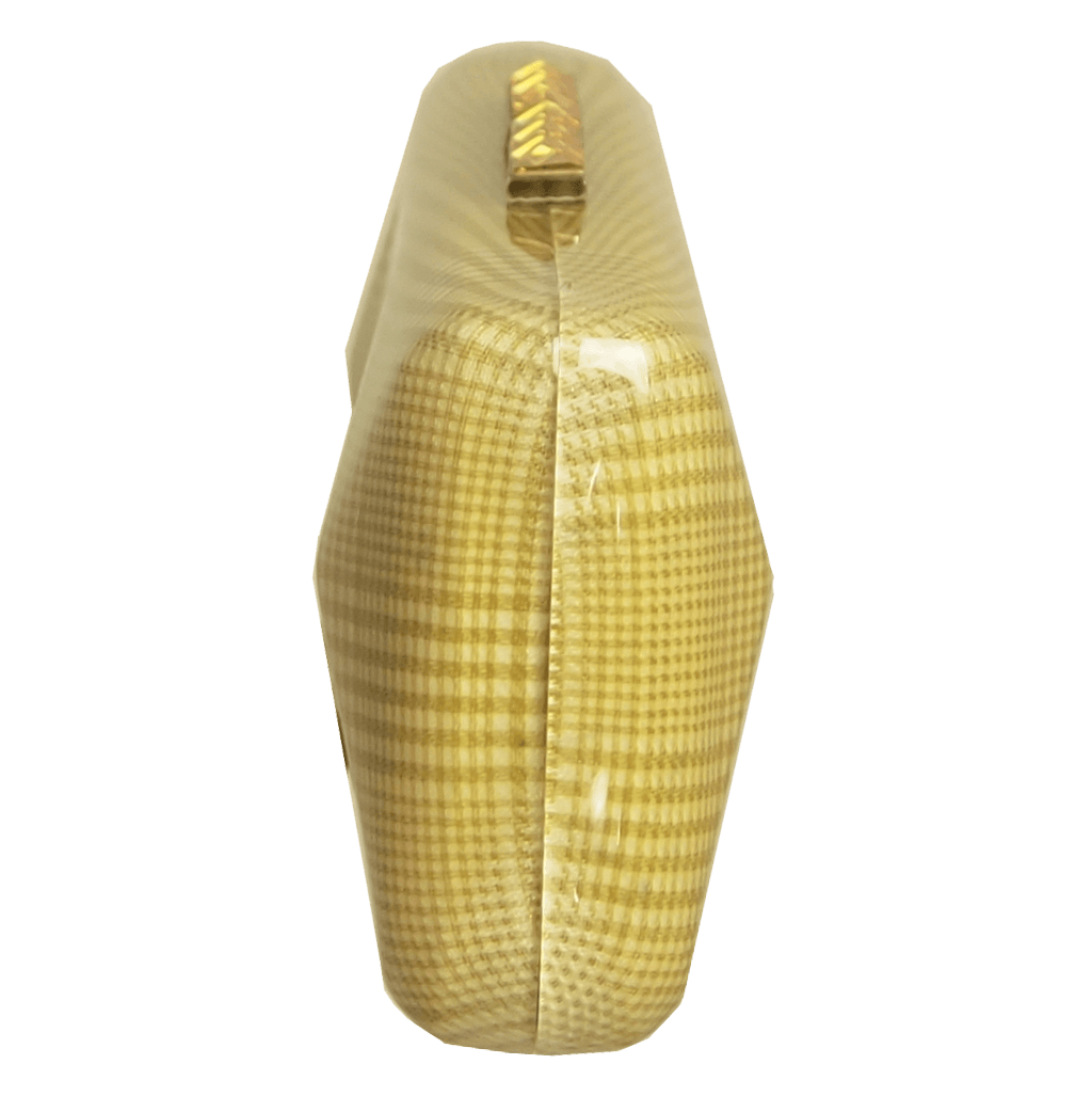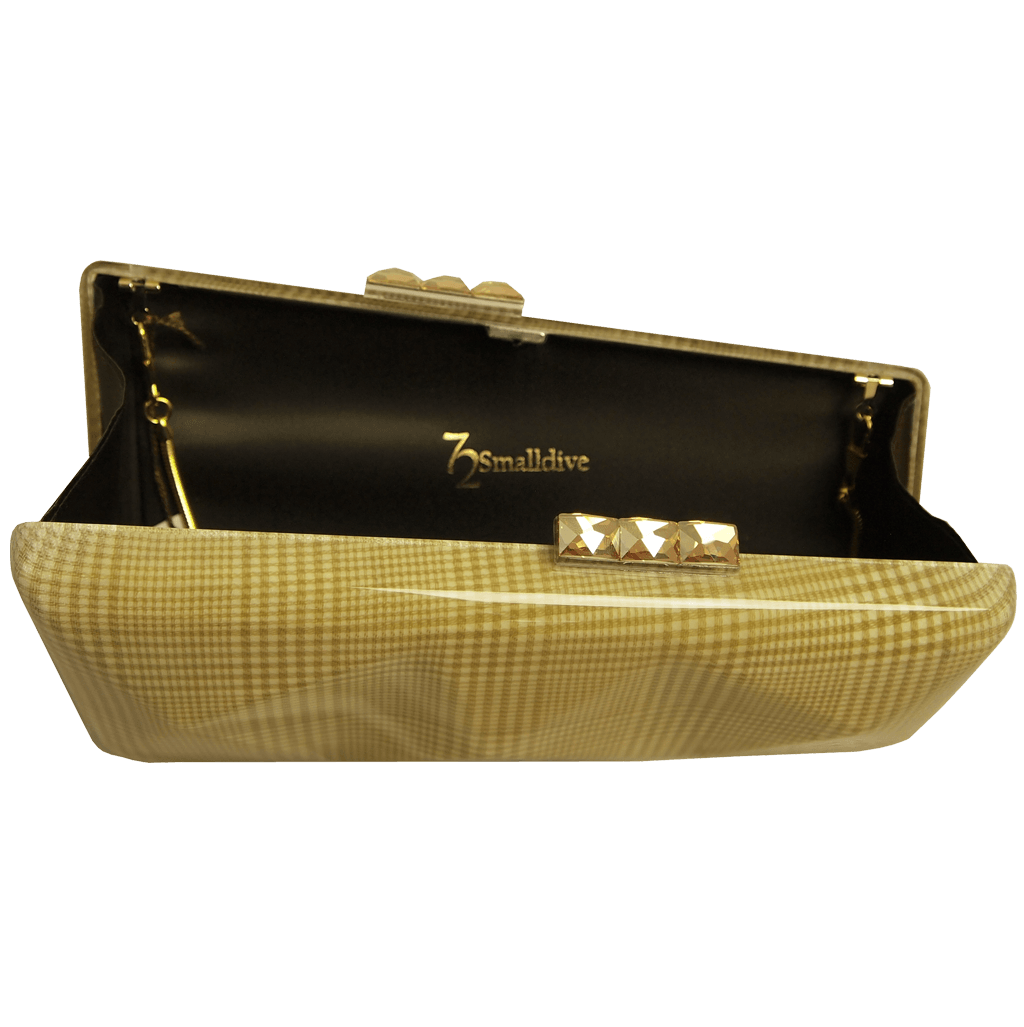 In this collective, tweed or tartan wool is laminated with clear hard glass acrylic forming the key aesthetic of this faceted minaudière. Inspired by high shouldered pad jackets of the 80s, this compact clutch is topped with Swarovski Elements as the clutch's clasp. It has a chain to be worn over shoulder. A truly sleek and minimal accessory to behold both during the day and night.