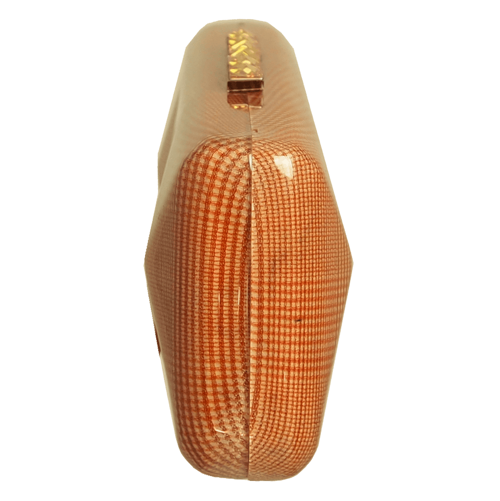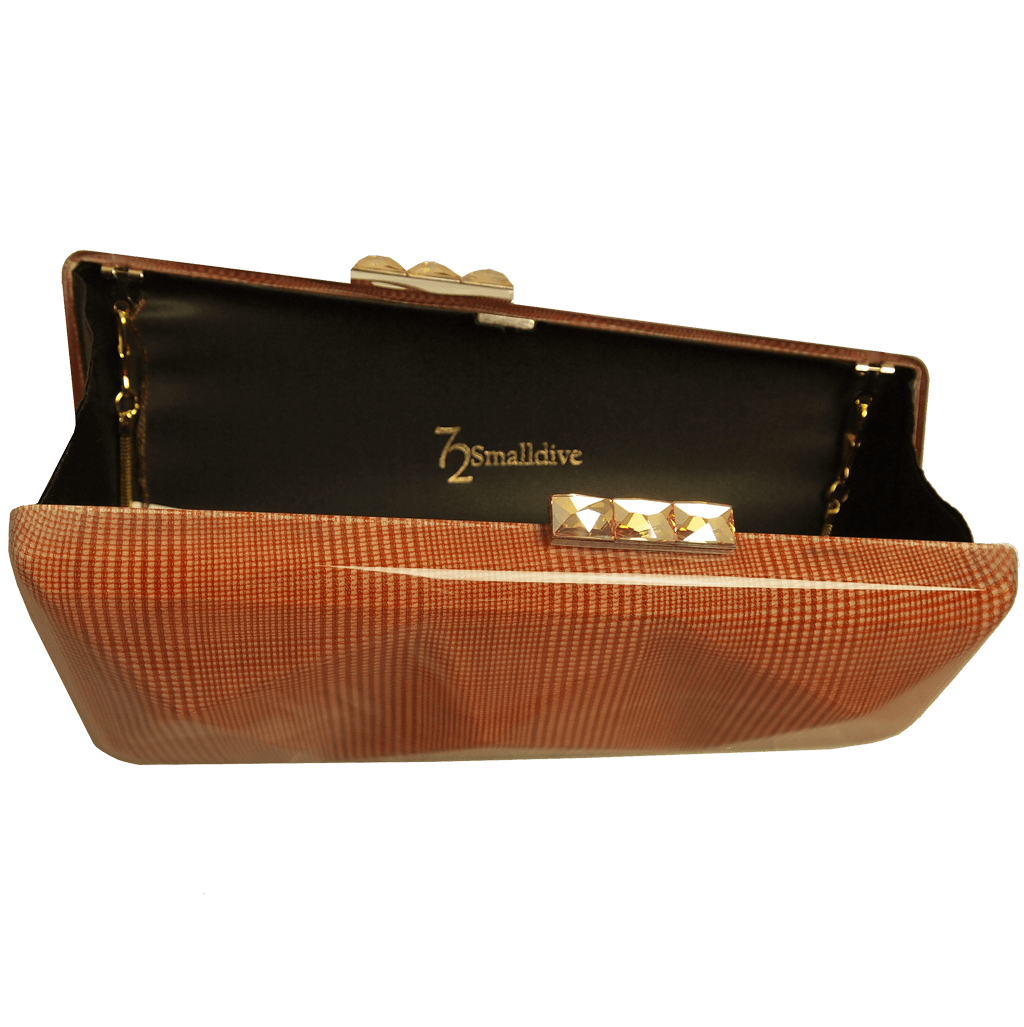 In this collective, tweed or tartan wool is laminated with clear hard glass acrylic forming the key aesthetic of this faceted minaudière. Inspired by high shouldered pad jackets of the 80s, this compact clutch is topped with Swarovski Elements as the clutch's clasp. It has a chain to be worn over shoulder. A truly sleek and minimal accessory to behold both during the day and night.