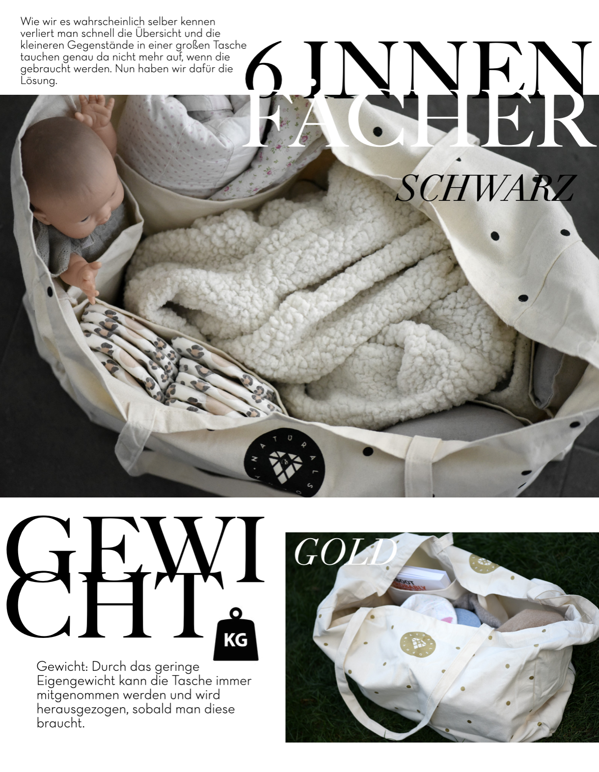 The NATURALSOPHY BAG is not just a simple, large shopping bag (approx: 60x40x30cm) with a low weight, but it is also a great mom / diaper / beach / toy holder/ shopping bag, which is divided by 6 inner compartments and therefore a perfect solution for everyone and every occasion.