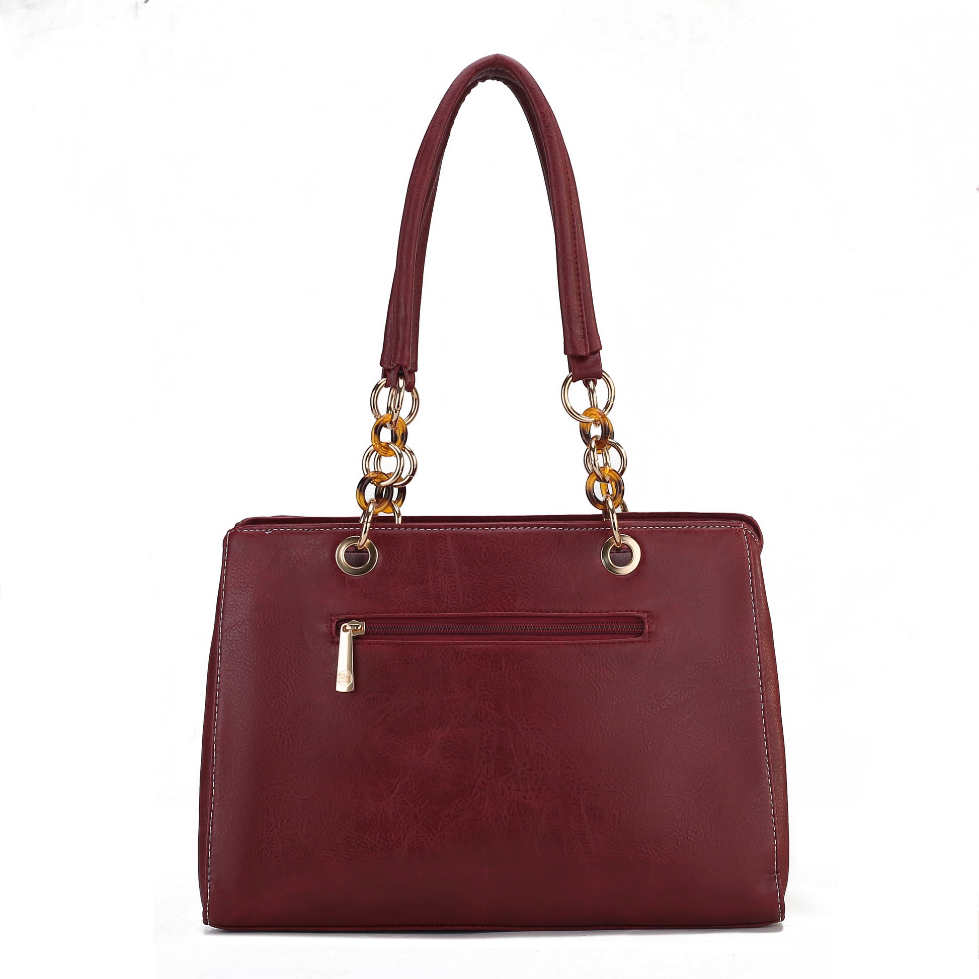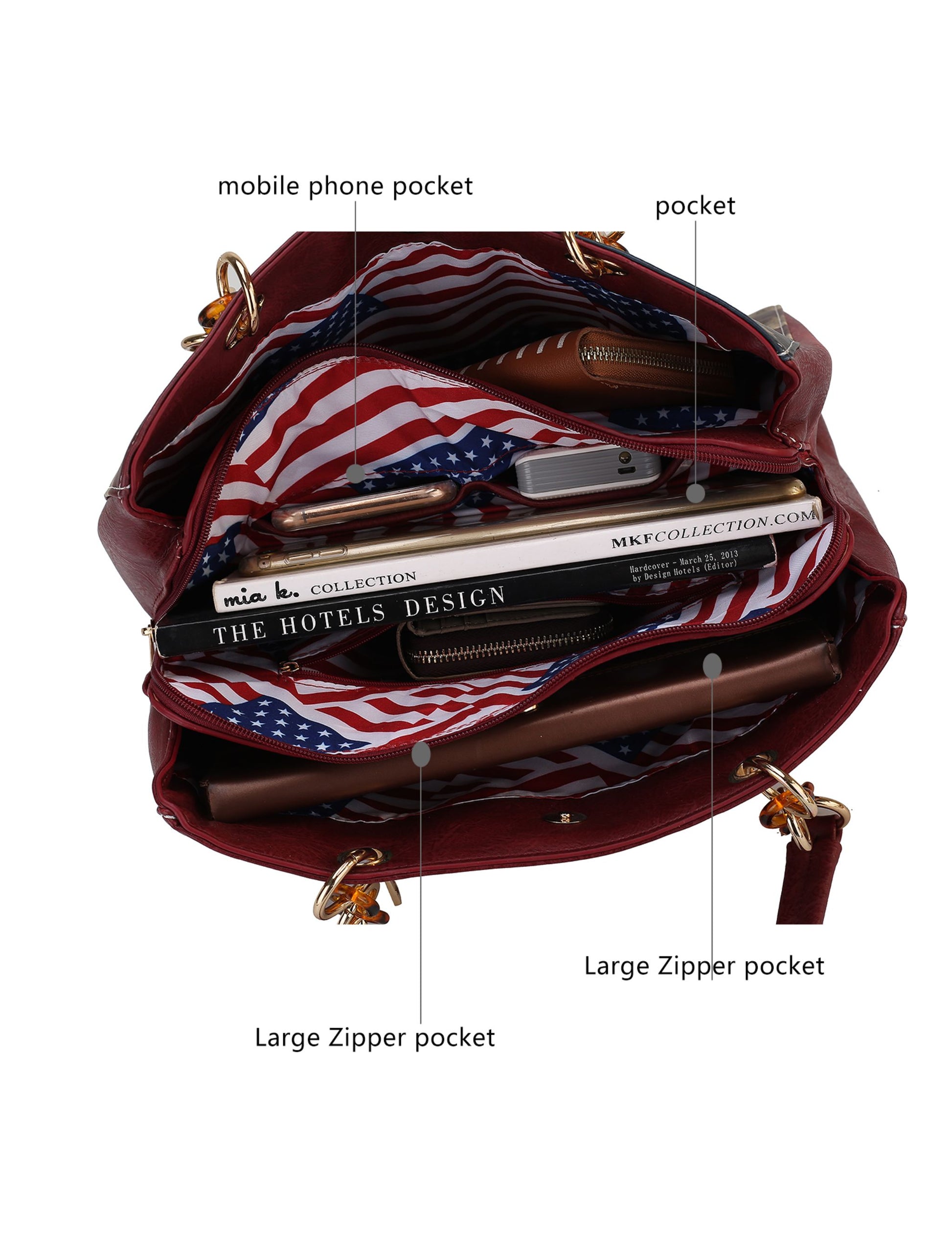 - The Nevaeh Shoulder bag is an ideal carryall. Rendered in a printed patriotic pattern in high-quality vegan leather, this three-compartments bag is designed to stow all you need for a busy day. Unzips the center compartment to reveal a printed lined interior with a wall-zippered pocket and slip pockets. The other two spacious compartments have a magnetic snap closure to keep all your belongings safe. It is designed with gold-tone embellishments and comes with a keychain with our round M emblem. The Nevaeh Shoulder Bag has a structured silhouette with a flat base for stability and protective metal feet. The Nevaeh Shoulder Bag is the perfect companion for any outing with various organizational features.
