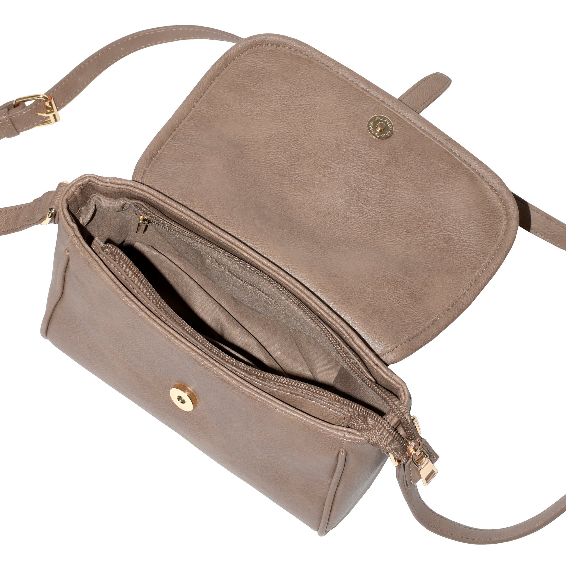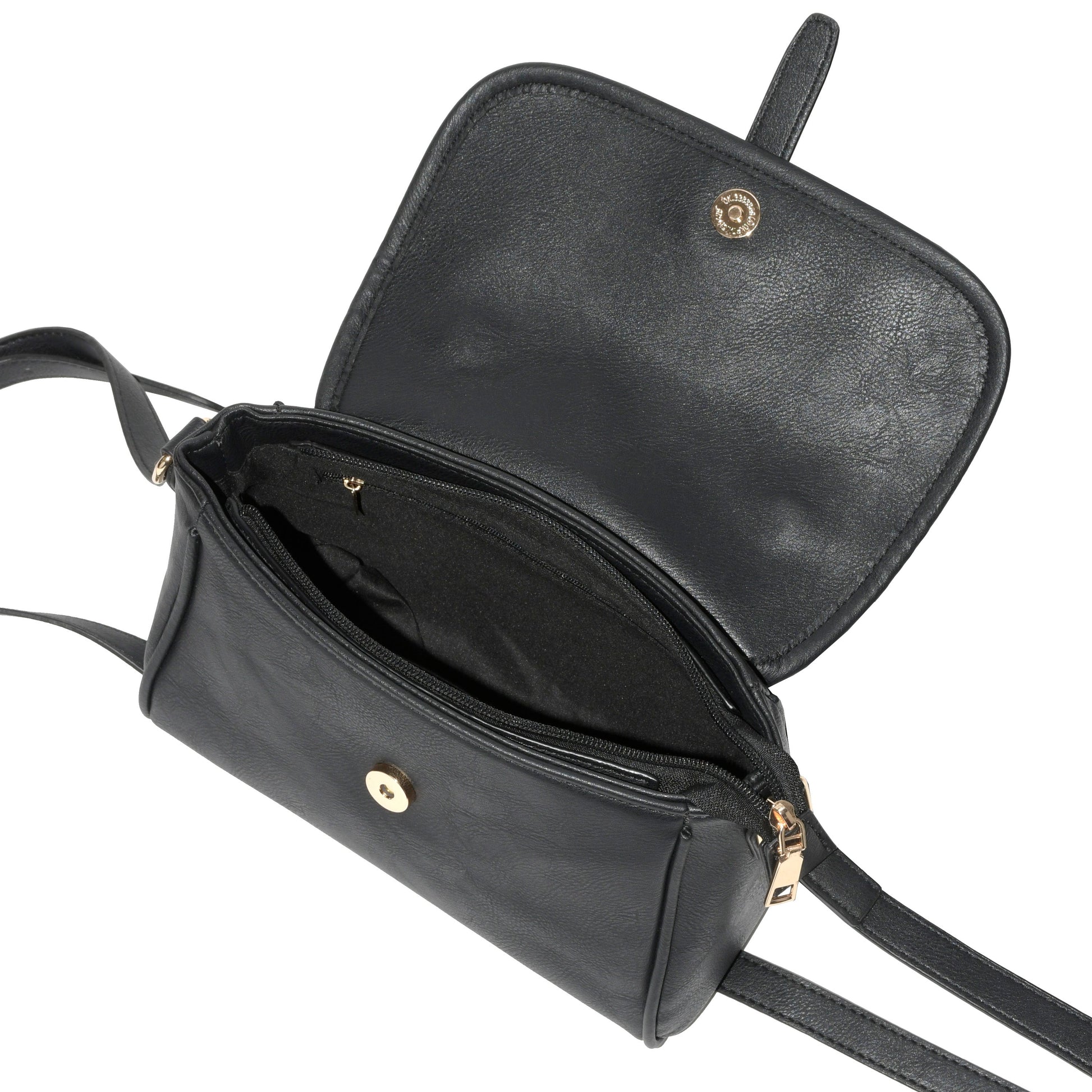 Step out in style with this NICCI Crossbody Bag with adjustable strap. Front flap with magnetic closure and top zipper for extra security to carry all your essential items. It opens to a spacious interior with inside zipper pocket and cell phone pocket. Soft PU leather and gold tone hardware accent, you'll love this chic and functional bag!