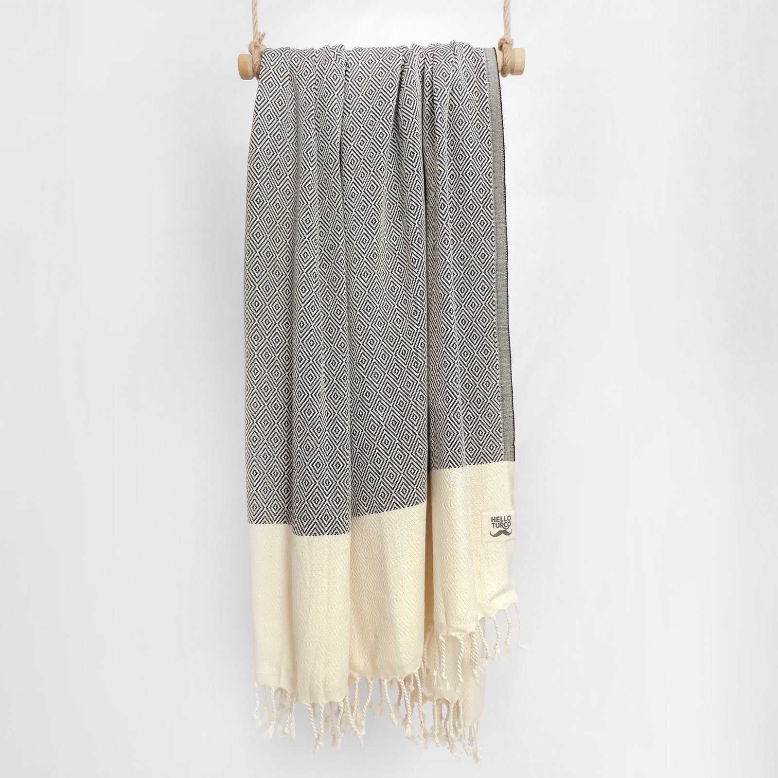 Otto Black Turkish towel has a soft silky touch. A fancy beach towel by day, shawl by night a sofa blanket or a baby blanket.