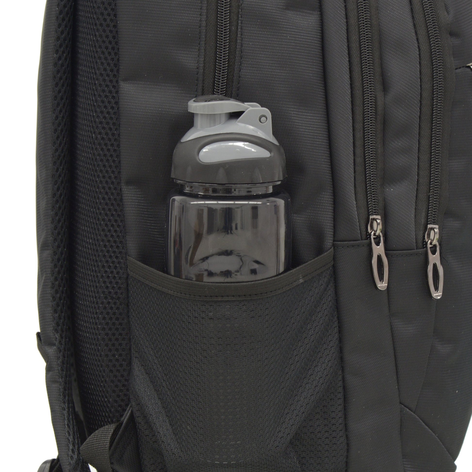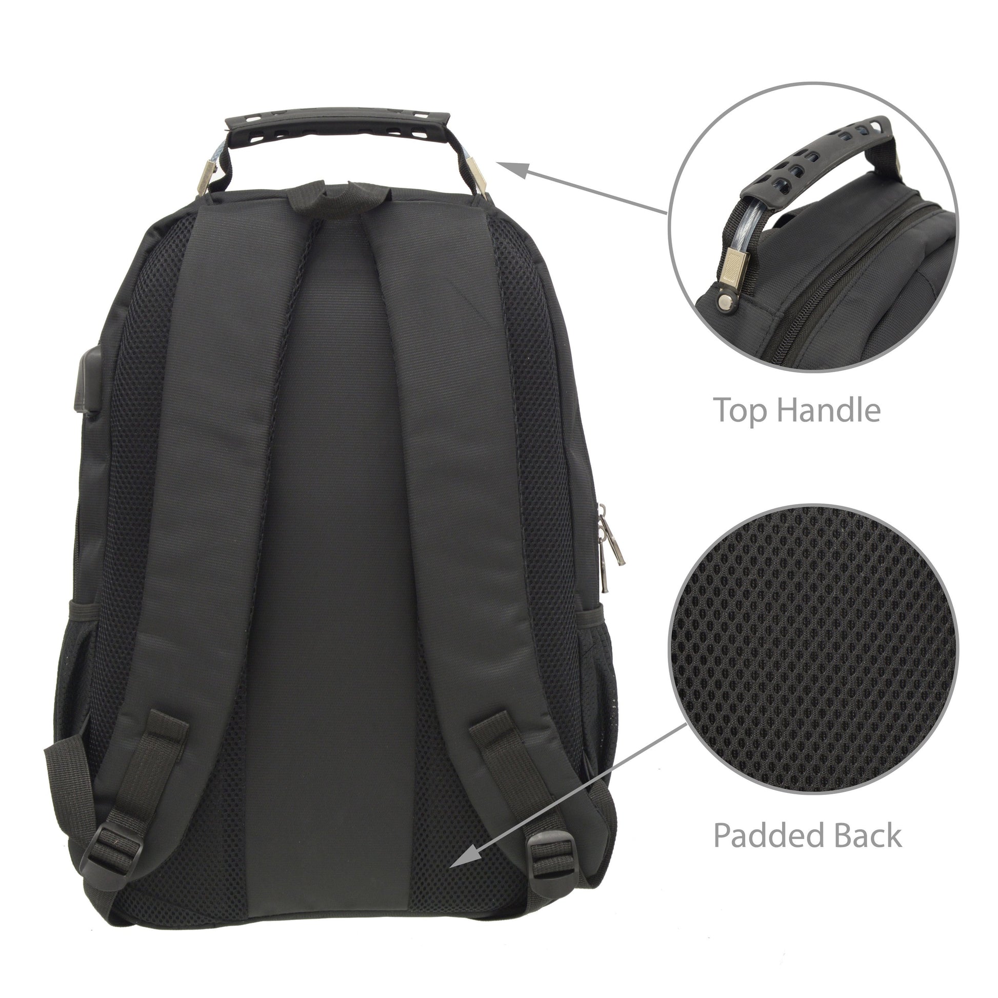 Single top handle with re-enforced grip, 4 Compartment with zipper closures, 1 Hidden front pocket, 2 Large accessories pocket, 1 main compartment with foam padded interior laptop holder, Polyester lined interior, 2 side polyester mesh pockets, Adjustable padded backpack straps.