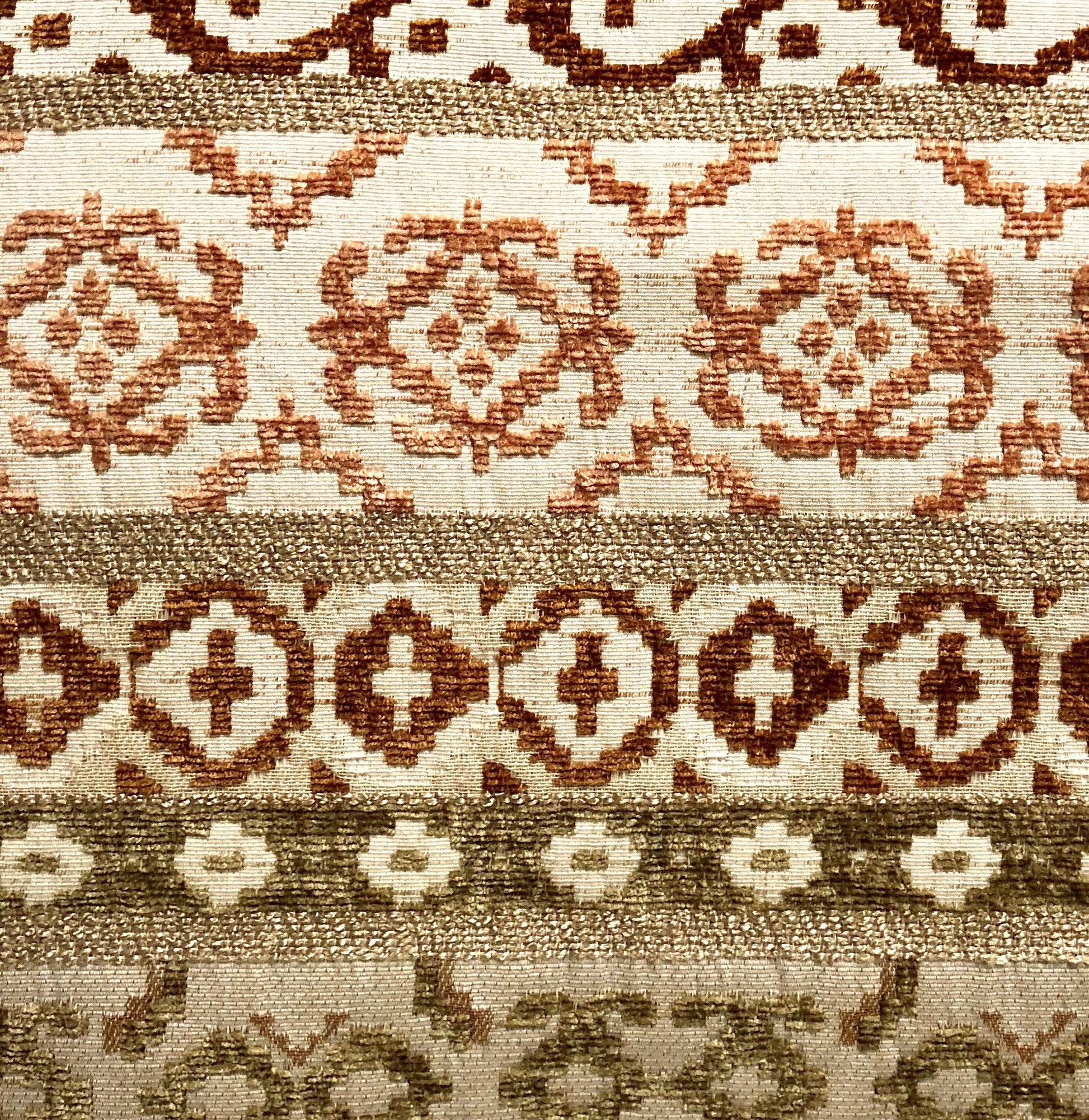 Accessorize your space with this designer arabesque shades of brown luxury throw pillow. The fabric of this trendy pillow is a blend of Rayon, Polyester, Cotton, and Nyl.