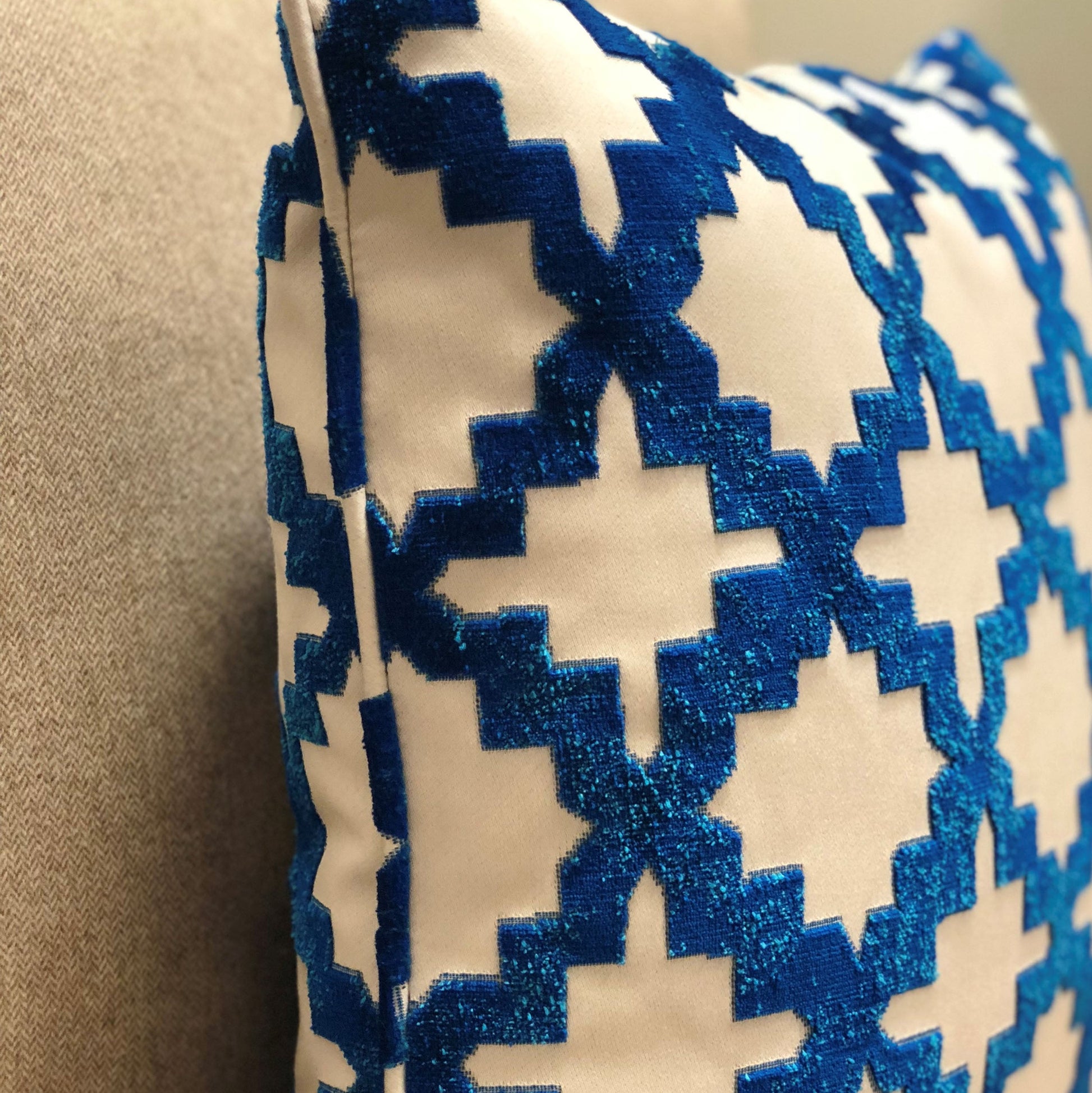 Elegance and Luxury is an understatement for this urbane classy decorative pillow. Bring sophistication and cheer to any room with this plutus velvety french medallion blue, off white luxury throw pillow. The fabric of this luxury pillow is a blend of Cotton.