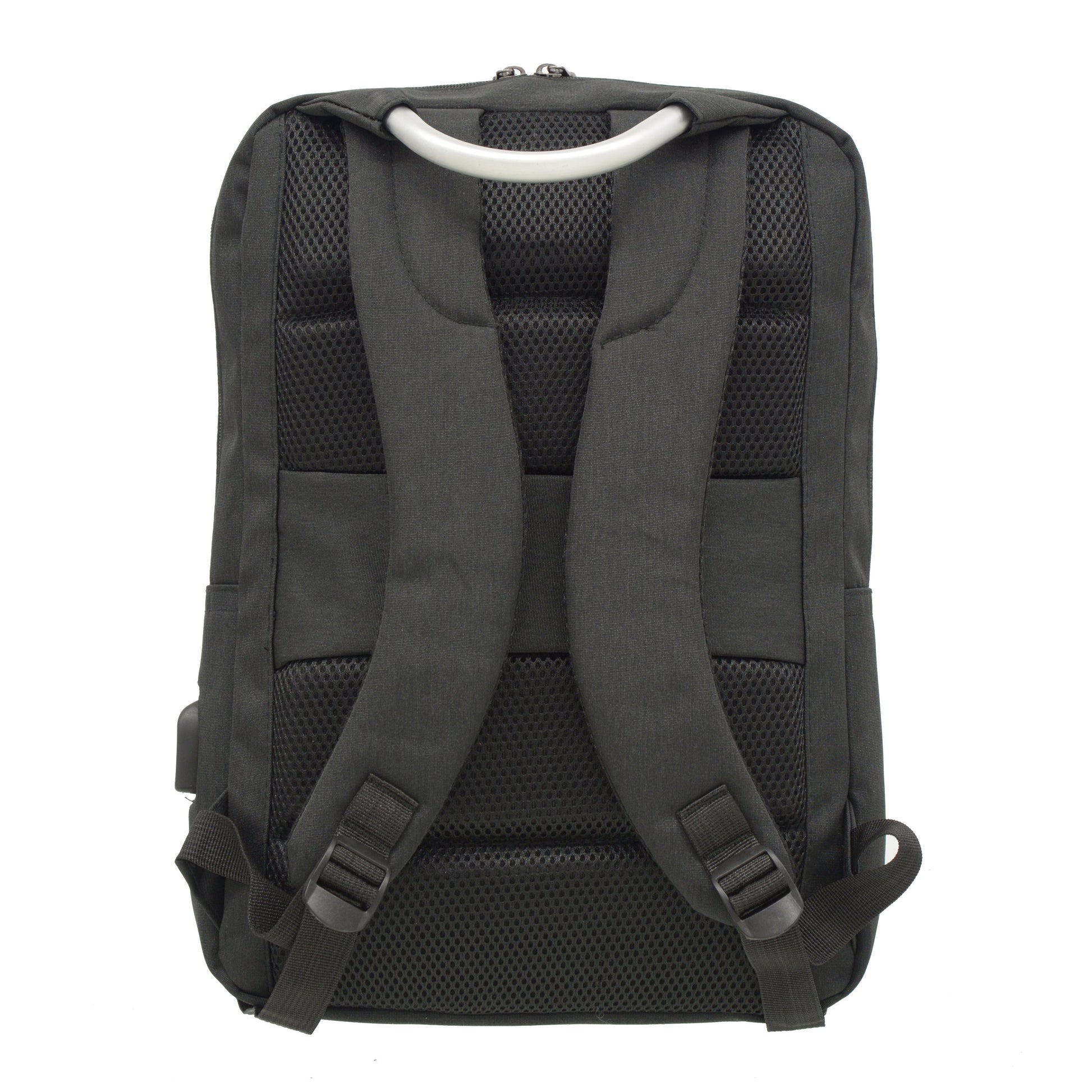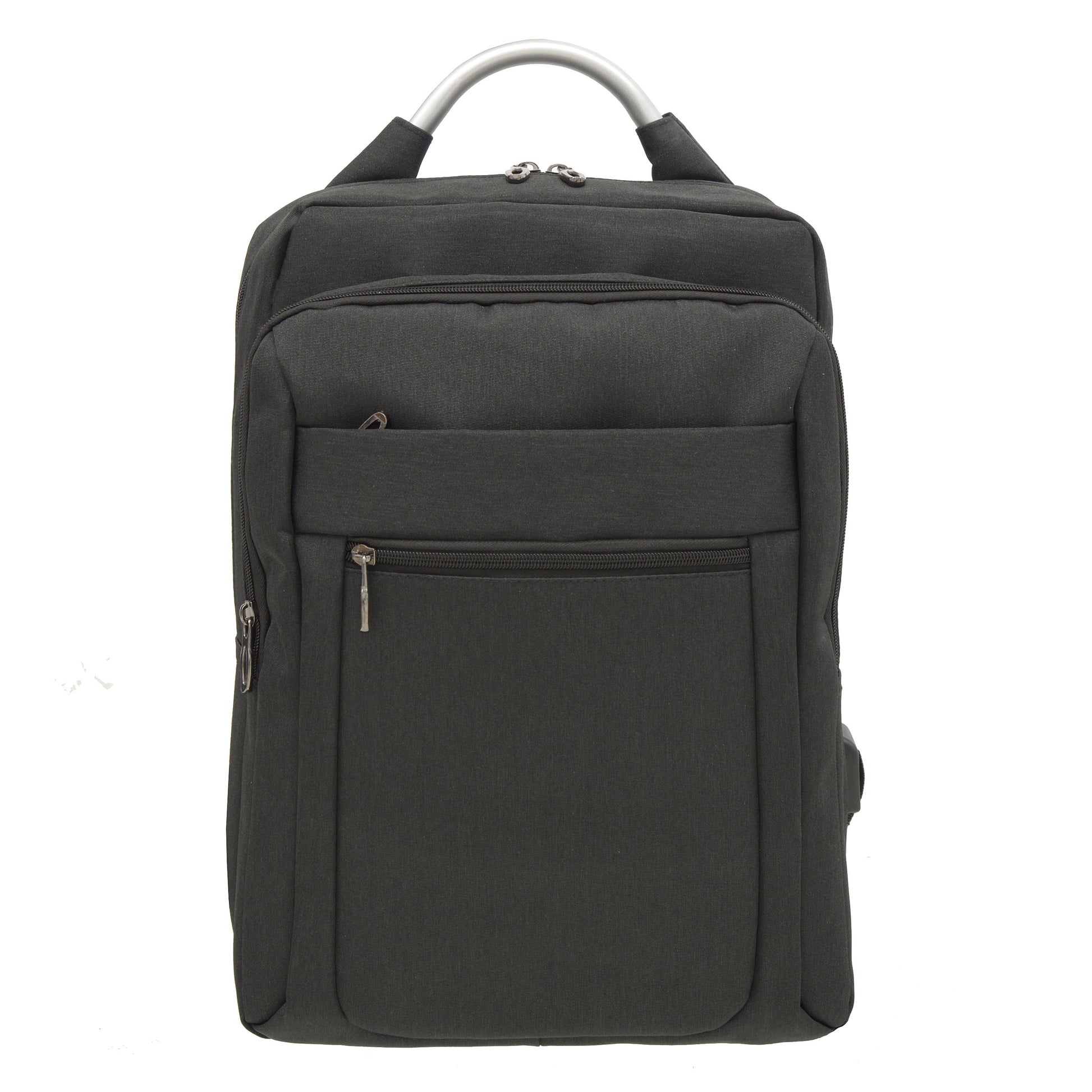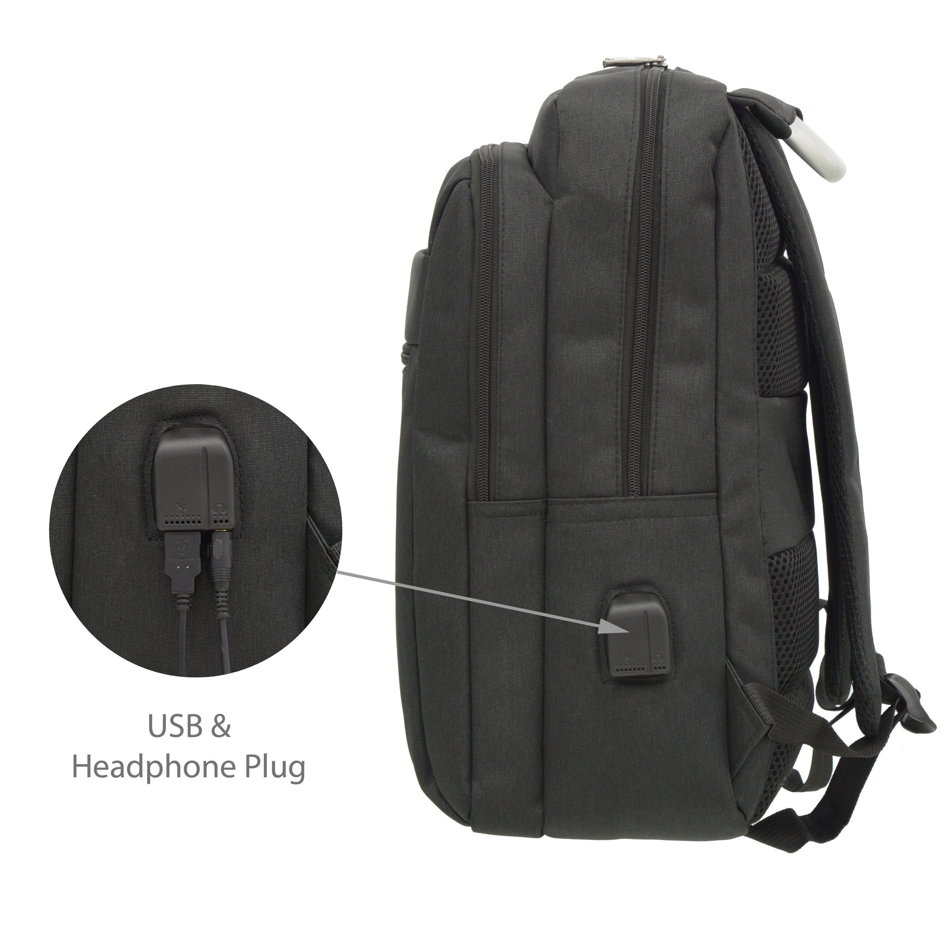 Single top handle, Zipper closure, 2 front zipper pockets with tablet space and classification pockets, Main interior compartment, Polyester lined interior, Foam padded interior laptop holder, USB and Headphone port, Adjustable padded backpack staps, Trolly Strap
