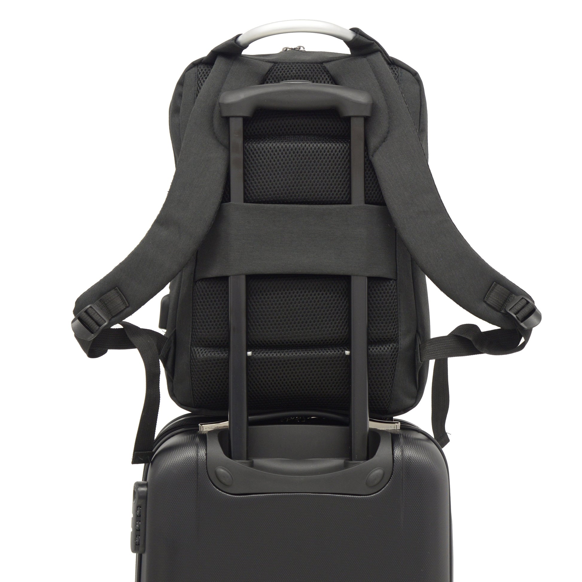 This smart backpack from Club Rochelier is fabricated in 600D polyester material. Features 3 zippered compartments for better organization. Small front pocket stores smaller accessories like your tablet or cell phone, Second zipper pocket is spacious enough for your tablet and sports classification pockets for more organized storage,. Main compartment features a secure laptop pocket and a hidden zippered compartment with USB cable and USB/Headphone ports. Comfortable padded backpack straps and Trolley strap, makes this bag perfect for the business traveler or busy student.